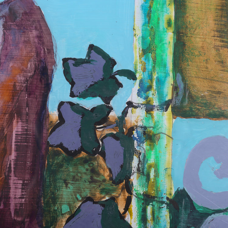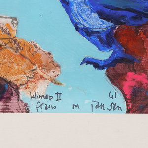 F.M. Jansen, Klimop II G I, jaartal onbekend. Gemengde techniek op papier in metalen lijst. Kleurrijke afbeelding van twee figuren met vogels en rechts klimop. Onderaan signatuur en titel. Conditie: goed, gebruikssporen aan lijst. Afmeting werk zonder lijst: 49 x 62 cm.
