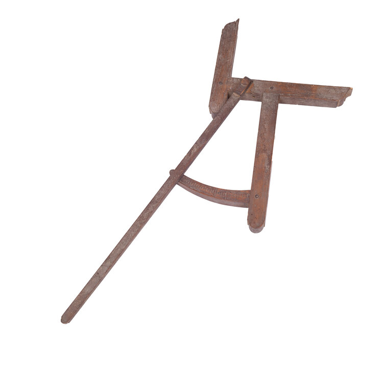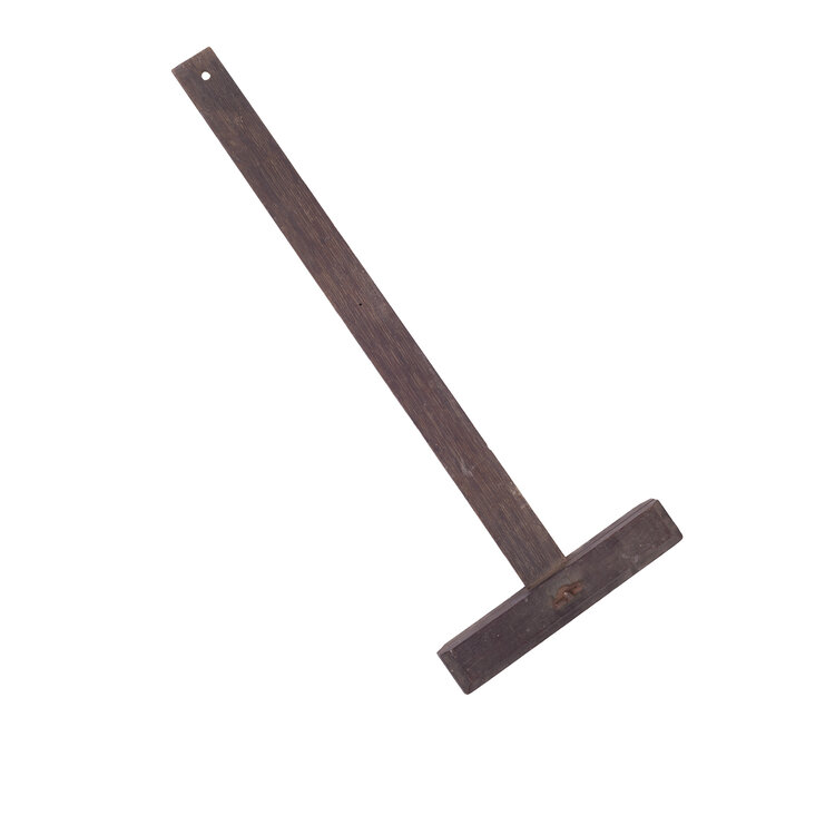 Vier stuks oud Hollands gereedschap met oa. een hoekmeetinstrument en een tekenhaak. Op het hoekmeetinstrument zitten streepjes/graden en een lat die de hoek kan aangeven. Antieke tekenhaken werden gebruikt op technische tekentafels om horizontale en verticale lijnen te trekken. Datering: 19e en 20ste eeuw. Conditie: gebruikssporen, oxidatie en houtwormgaatjes. Afmetingen: ca. 80 x 20 x 20 cm.