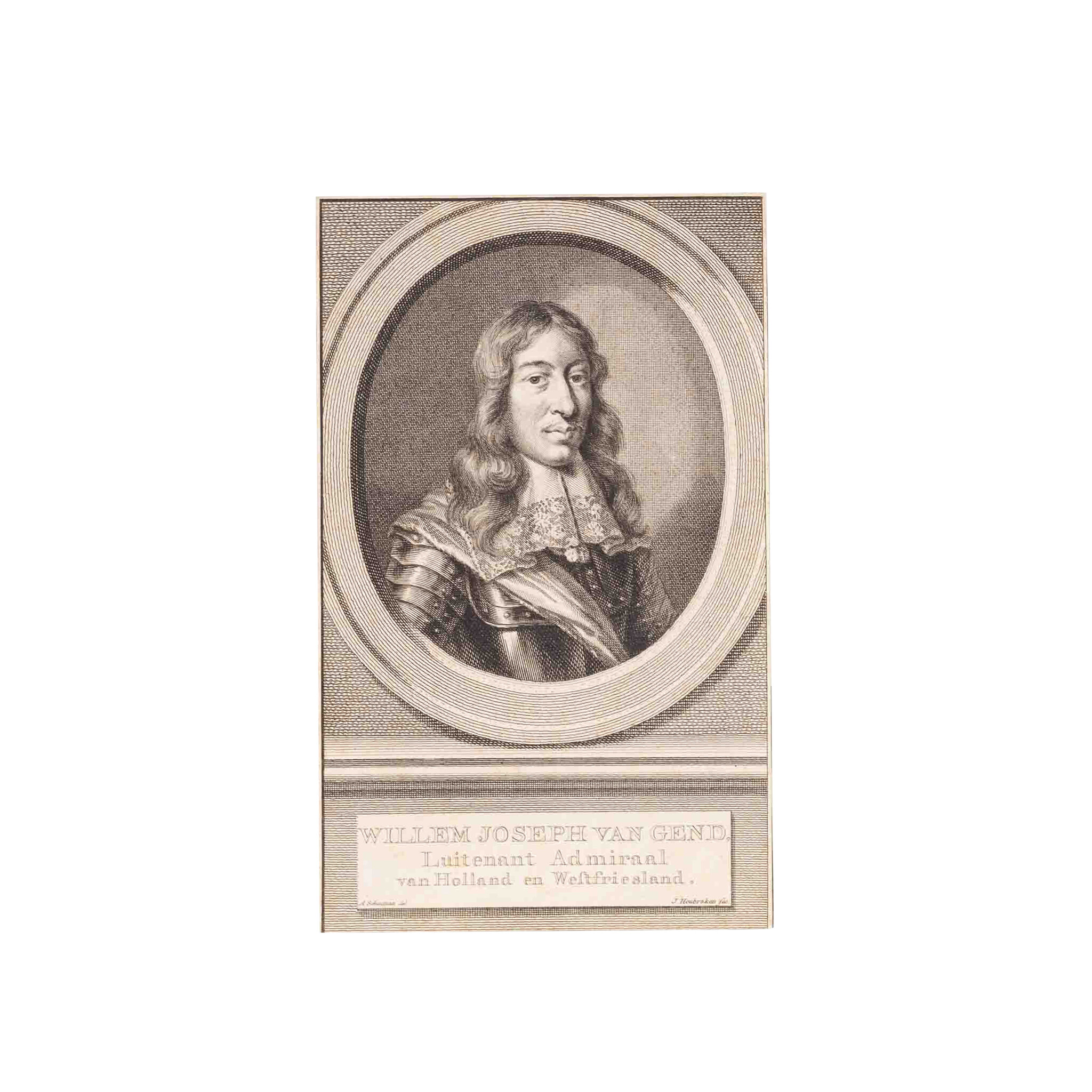 Prent 'Jan van Galen' (Essen, 1604/1605 - Livorno, 23 maart 1653), Kommandeur ter Zee; Prent 'Willem Joseph van Gend' (Winssen, 14 mei 1626 - Slag bij Solebay, 7 juni 1672), Luitenant Admiraal van Holland en Westfriesland; Prent 'Joos de Moor' (circa 1548 - Vlissingen 18 februari 1618), Vice Admiraal van Zeeland; Prent 'Tjerk Hiddes de Vries' (Sexbierum, 6 augustus 1622 - Vlissingen, 6 augustus 1666), Luitenant Admiraal van Frieslandt. Gravures van Jacob Houbraken. De prenten zijn zwart-wit. Datering: ca. 1749-1760. Conditie: De prenten vertonen sporen van ouderdom. Verkleuring, vlekken en kleine beschadigingen aan de randen. Afmetingen beeldvlak prenten: ca. 17 x 10 cm.