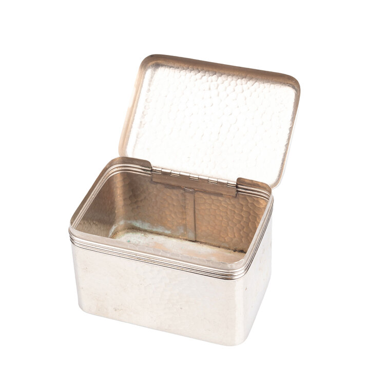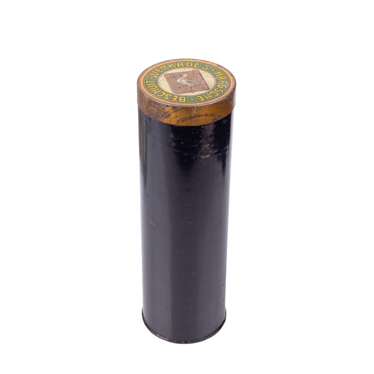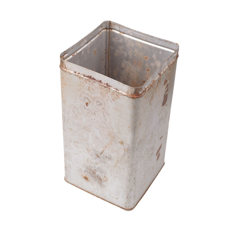 Smalle beschuitbus met op deksel: "Haagsche Beschuitbus". Op onderzijde "Verkade's Haagsche Beschuit. NV Bakkerij "DE RUYTER" der firma Verkade & Comp. Zaandam" (21.3 x 6.5); Leeg cacaoblik zonder deksel en etiket (18.5 x 10); Gehamerd metalen blikje, zilverkleurig (7x10x7); Klein apotheker blikje met afbeelding van drie figuren en de tekst "Maatschap Apotheken de Vijzel"(10 x 6 x 2). Datering onbekend. Conditie: Roestig, gebruikssporen.
