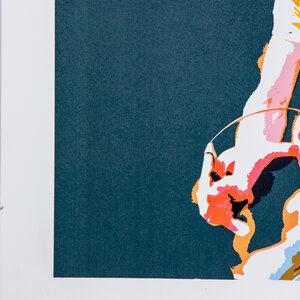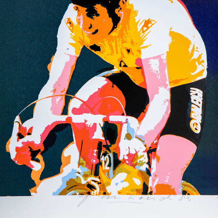 Frank Gude, Joop Zoetemelk, 1983. Zeefdruk op papier, E.A. Afbeelding van de wielrenner Joop Zoetemelk in rood, geel en roze voor donkere achtergrond. Rechtsonder signatuur en jaar. Conditie: goed, paar vlekjes aan de zijkant. Afmeting: 71 x 76 cm.