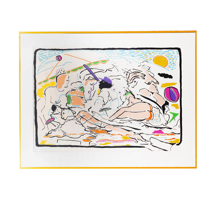 Frans van Klingeren (1948 - 2001), 'Druk Strand', 1989. Zeefdruk op papier in gele lijst, oplage 25/40. Kleurrijke compositie van mensen aan het strand. Signatuur rechtsonder. Conditie: goed, enkel de lijst toont wat gebruikssporen zoals krasjes. Afmetingen lijst: 65,5 x 82,5 cm; beeldvlak: 50 x 69 cm.