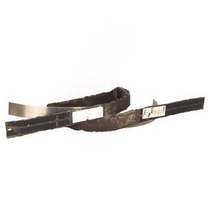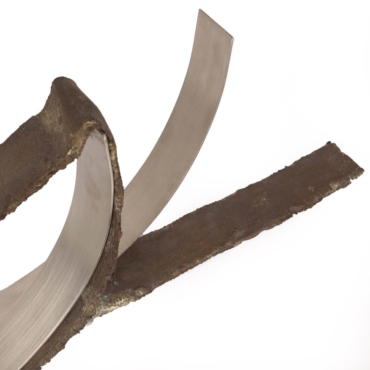 Fredy Wolf, Zonder titel, jaartal onbekend. Stalen sculptuur van gebogen plaatmateriaal en staalplastiek. Conditie: gebruikssporen zoals krassen en roest. Afmeting: H25 x B70 x D10,5 cm.