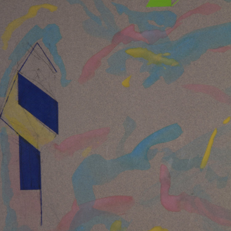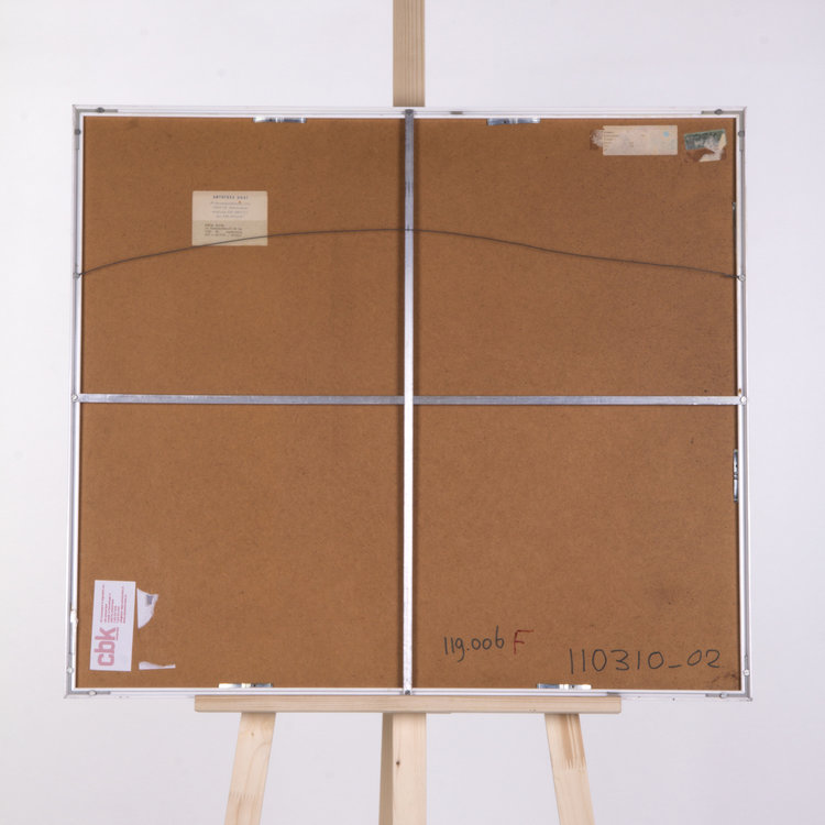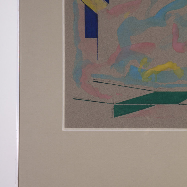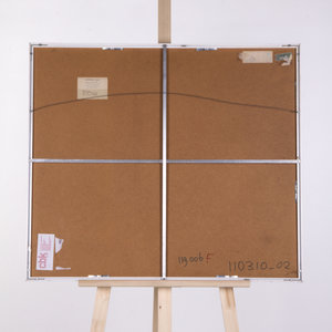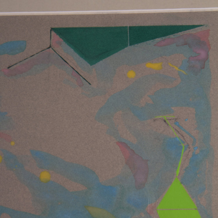 Frits Nolte, The Aviary. Acrylverf op papier. Het betreft een weergave van abstracte figuren en lichte kleuren. Het werk is niet gesigneerd of voorzien van een datering. Datering: ca. 1990-1999. Conditie: het werk is in goede staat, maar de lijst heeft lichte schade opgelopen. Afmetingen: ca. 70,0 x 80,0 cm.