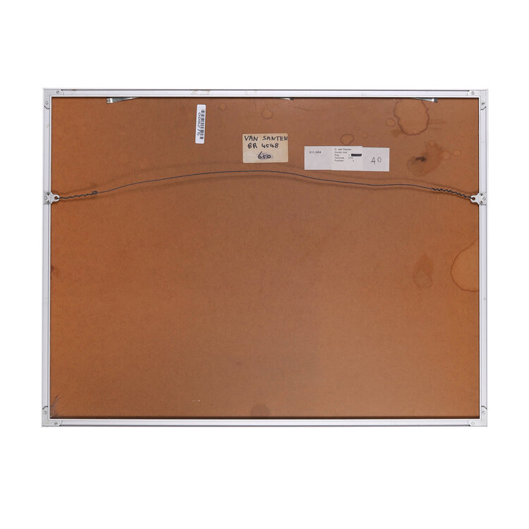 G. van Santen, Zonder titel, 1989. Litho in metalen lijst, oplage 4/5. Abstracte voorstelling in paars, rood, blauw en geel. Linksonder signatuur en jaar, rechtsonder oplagenummer. Conditie: gebruikssporen aan lijst en linksonder een vlekje in passe-partout. Afmeting lijst: 61 x 81 cm.