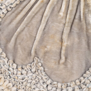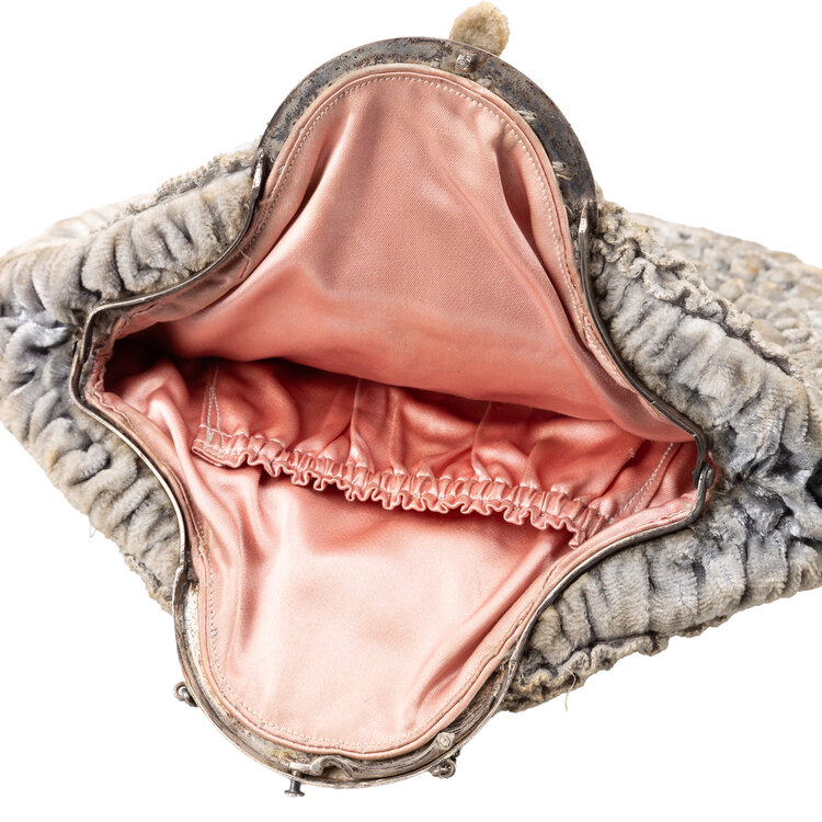 Gala setje met avondtas en handschoenen, 20ste eeuw. Een antiek grijs fluwelen avondtasje met metalen beugel en ketting. Het tasje heeft aan de binnenzijde een zalmroze voering; Roze satijnen galahandschoenen met een inzetstuk van transparante stof bij de handpalm. Conditie: vertonen sporen van gebruik en ouderdom, zoals vlekken op het tasje. Afmetingen avondtas: 19 x 20 x 4 cm; hoogte met hengsel 28 cm. Afmetingen handschoenen: ca. 39 x 9 cm.