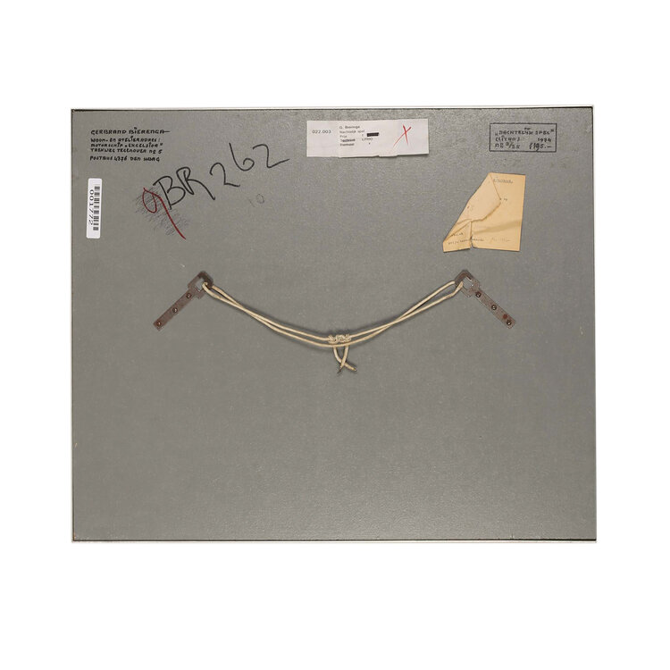 Gebrand Bieringa, Nachtelijk spel, 1974. Litho in metalen lijst, oplage 3/35. Afbeelding van een naakte vrou met vogelmasker en een naakte man met paardenmasker die grote opstaande schelpen vasthouden. Linksonder titel en oplagenummer, rechtsonder signatuur en jaar. Conditie: goed, gebruikssporen aan lijst. Afmeting lijst: 51 x 61 cm.