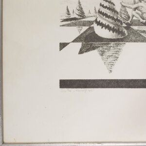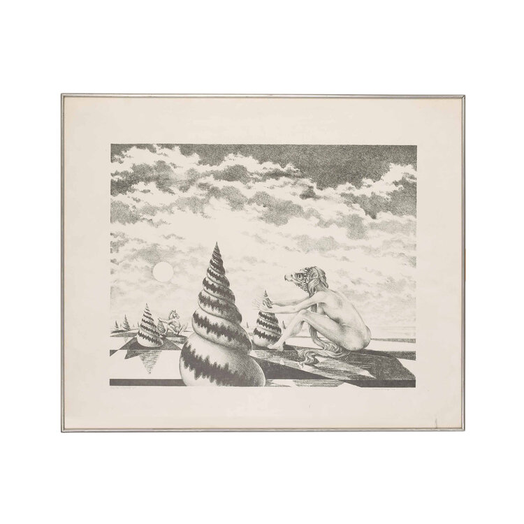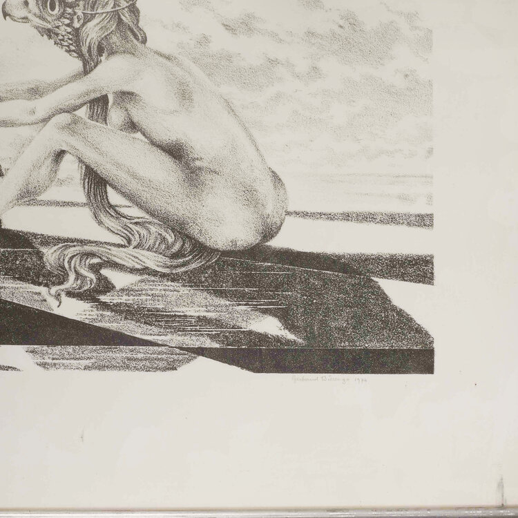 Gebrand Bieringa, Nachtelijk spel, 1974. Litho in metalen lijst, oplage 3/35. Afbeelding van een naakte vrou met vogelmasker en een naakte man met paardenmasker die grote opstaande schelpen vasthouden. Linksonder titel en oplagenummer, rechtsonder signatu
