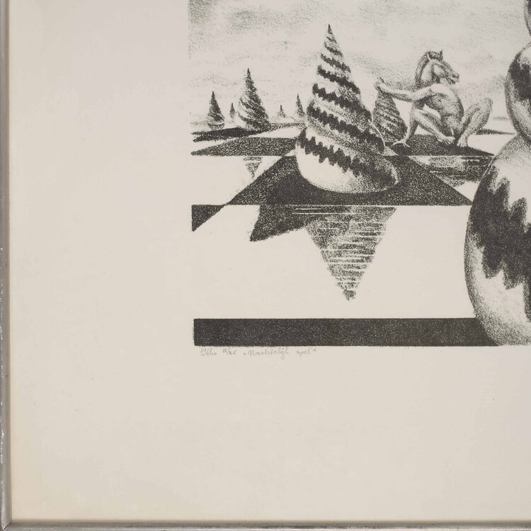 Gebrand Bieringa, Nachtelijk spel, 1974. Litho in metalen lijst, oplage 18/35. Afbeelding van een naakte vrou met vogelmasker en een naakte man met paardenmasker die grote opstaande schelpen vasthouden. Linksonder titel en oplagenummer, rechtsonder signatuur en jaar. Conditie: goed, gebruikssporen aan lijst. Afmeting lijst: 51 x 61 cm.