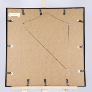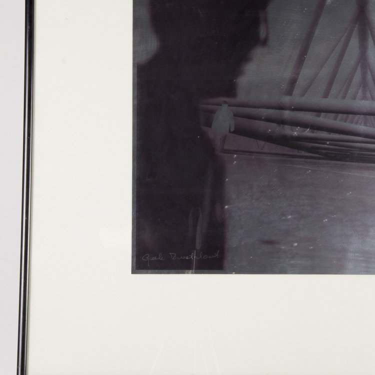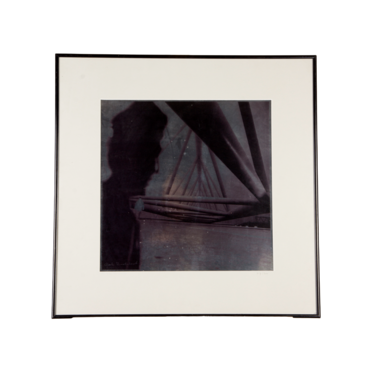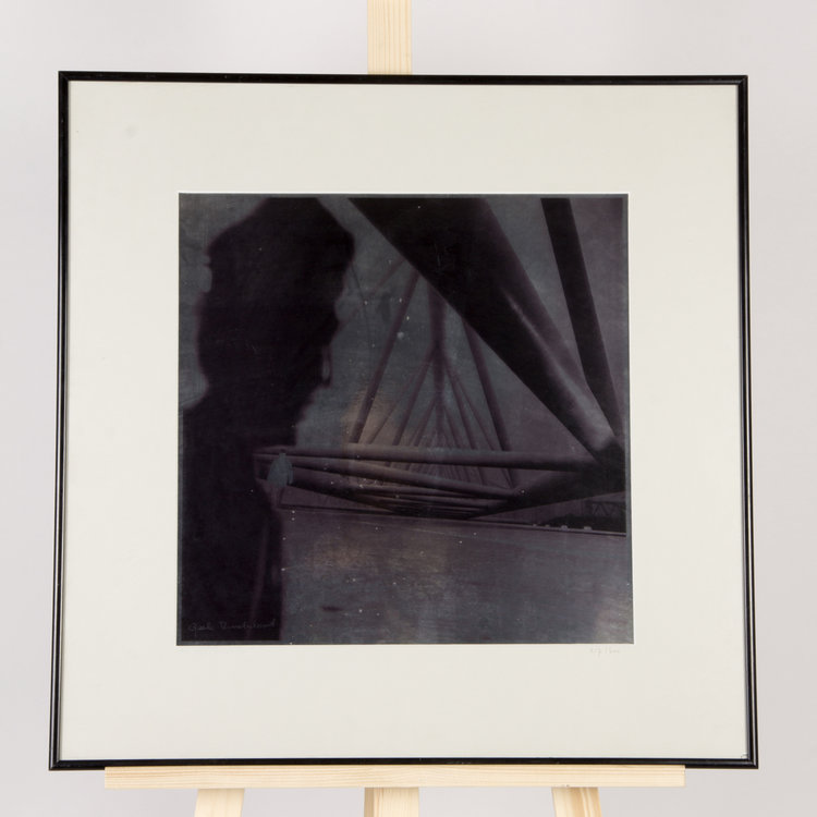 Geek Zwetsloot, Zonder Titel, fotografie en spiegel. Het werk toont een figuur bij een brug. Linksonder werd het gesigneerd en rechtsonder is op het passe-partout het oplagenummer 217/600 aangebracht. Geek Zwetsloot is een Nederlandse fotograaf. Hij volgde zijn opleiding aan de Fotovakschool in Apeldoorn. Datering: eind 20ste eeuw. Conditie: het werk is in goede staat, maar het is aan te raden om het werk opnieuw in te lijsten. De lijt heeft namelijk schade opgelopen en het glas is onderaan in de rechterhoek gebroken. Afmetingen: ca. 61,0 x 40,0 cm.