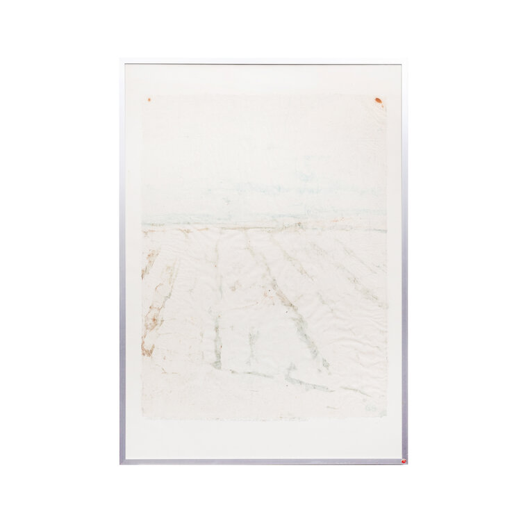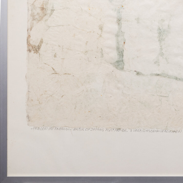 Gerda Spierenburg (Hengelo (Overijssel), 1923), 'Prielen in de sneeuw', ca 1982. Batik op Japans rijstpapier met drie verf/wasbehandelingen in metalen lijst. Afbeelding van een landschap met daarboven een blauwe lucht. Signatuur middenonder. Conditie: verkleuring werk met name bovenaan in de hoeken, gebruikssporen lijst. Afmetingen lijst: 71 x 51 cm; beeldvlak: 56 x 43 cm.