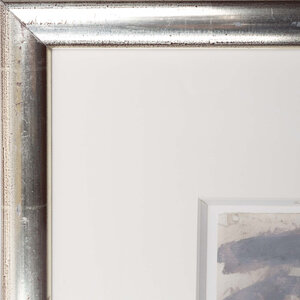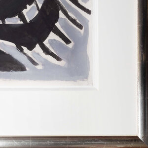 Gust Romijn, 'Zonder titel', ca. 1950. Gouache in zilverkleurige lijst met passe-partout. Een tekening in cobrastijl van figuur met handen en een vogelachtige in zwart met grijze achtergrond. Linksonder signatuur. Conditie: goed, de lijst toont lichte gebruikssporen. Afmeting lijst: 78 x 90 cm.