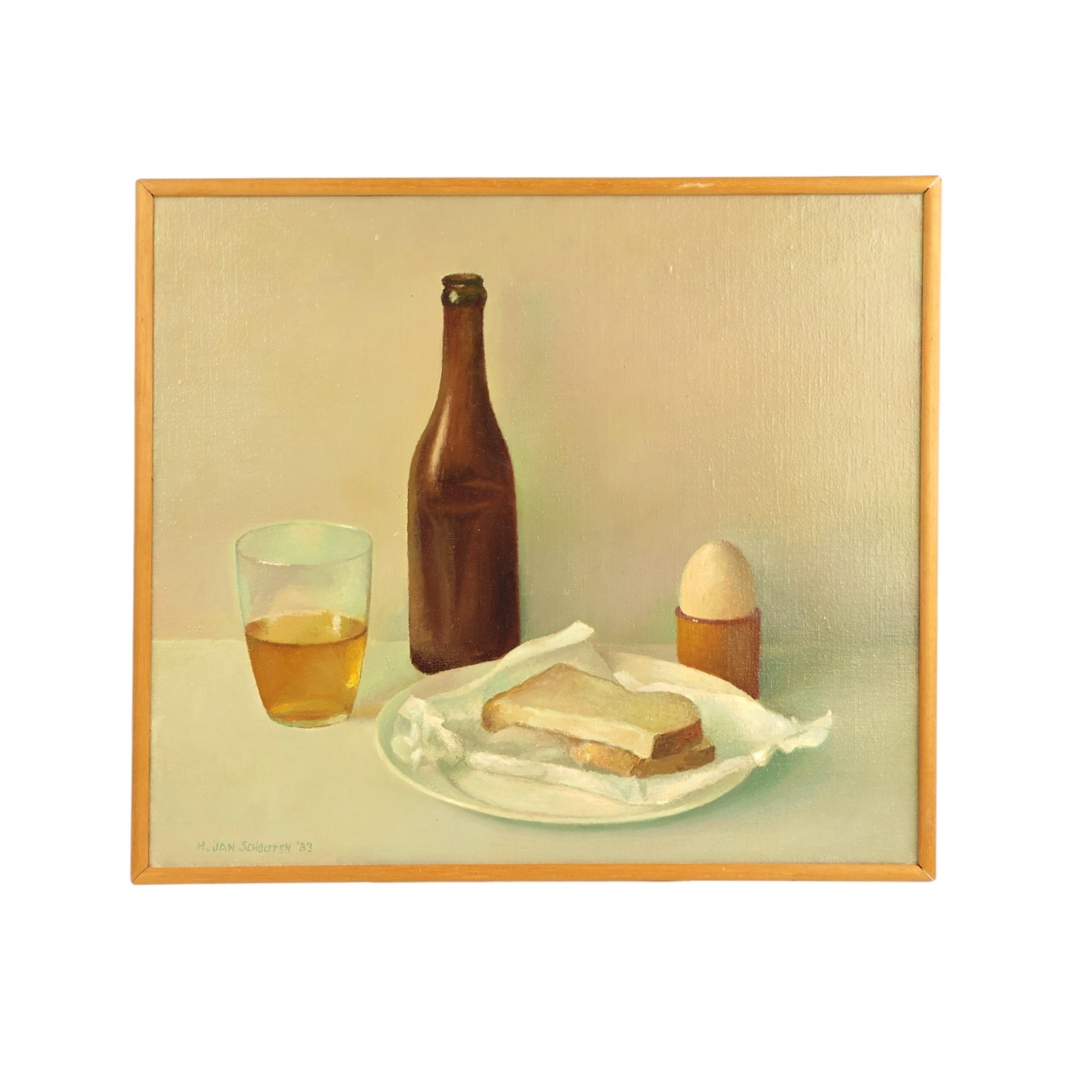 H. Jan Schouten, 'Breakfast', 1983. Oil on canvas. Still life of a breakfast of bread, egg and a yellow drink. Signature at bottom left. Jan Schouten (Rotterdam 1906 - Gouda 1987). After studying at the Academie voor Beeldende Kunst in Tilburg, he settled in Gouda in 1949 as a painter. He was the director of the Stedelijke Musea Gouda from 1956 until he retired. Condition: good, signs of wear on frame. Dimensions: image plane 35.2 x 40.6 cm, with frame 36.4 x 41.3 x 3.5 cm.
