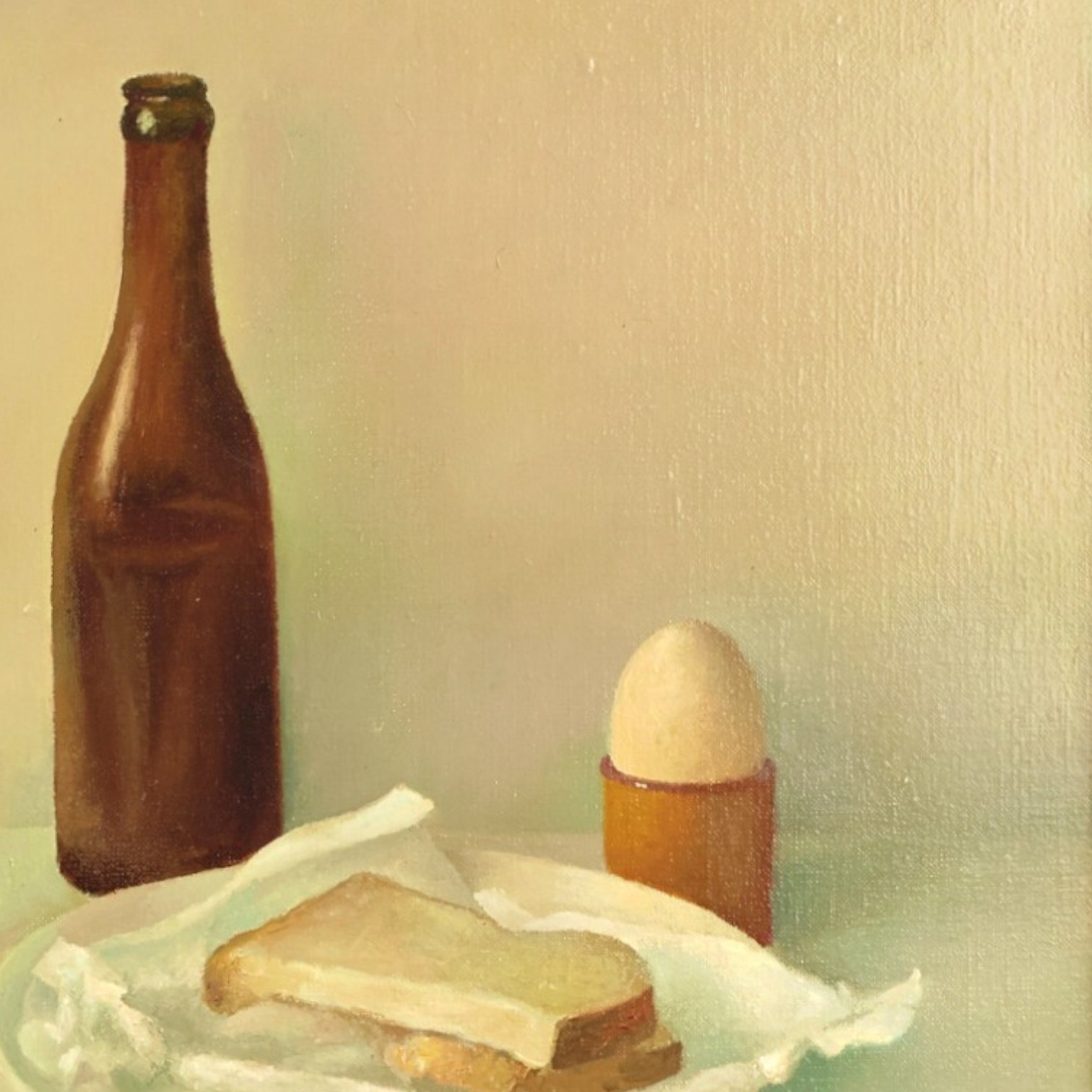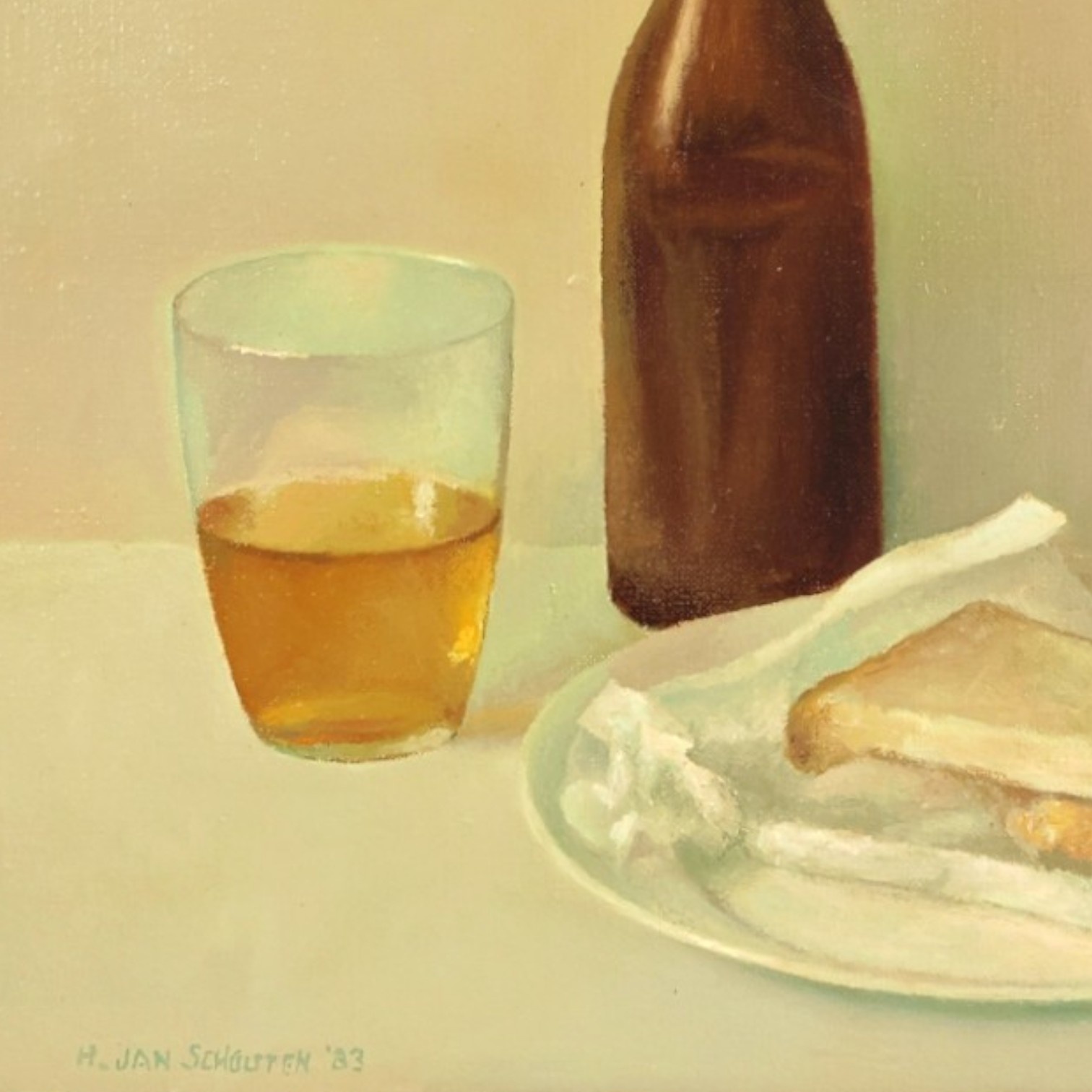 H. Jan Schouten, 'Breakfast', 1983. Oil on canvas. Still life of a breakfast of bread, egg and a yellow drink. Signature at bottom left.
