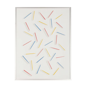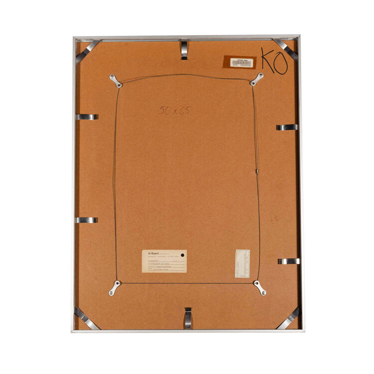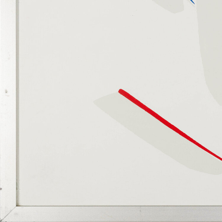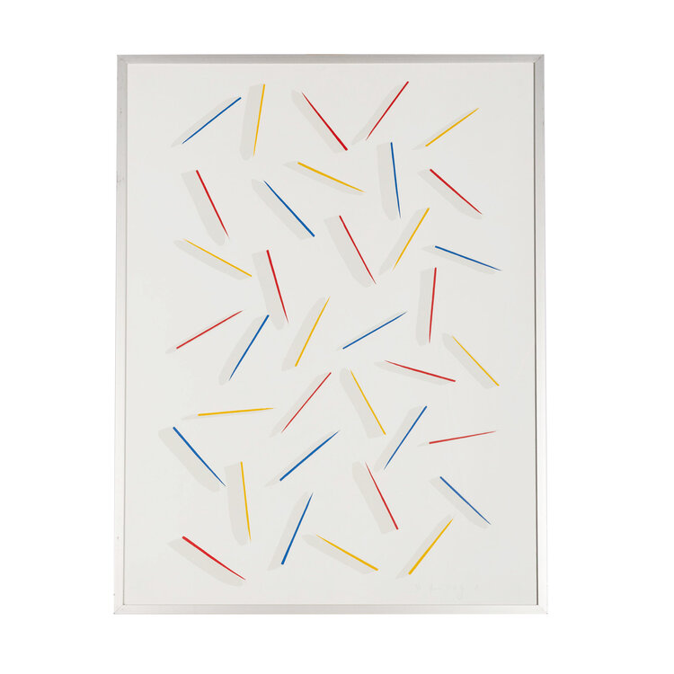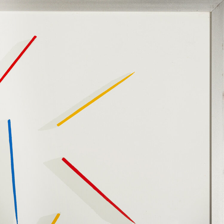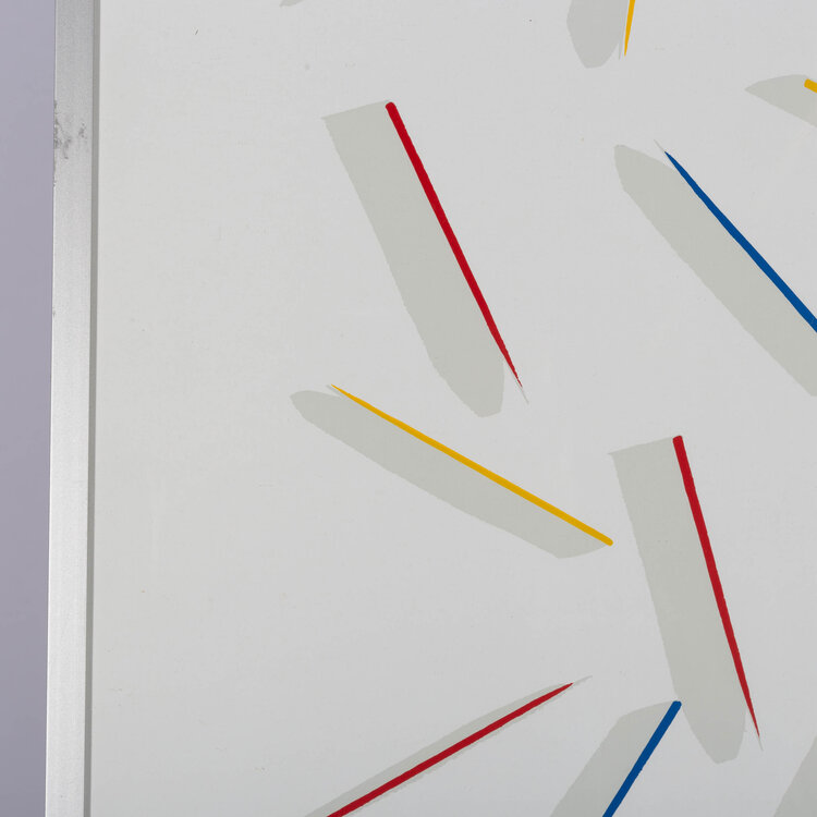 H. Korff de Gidts, 'Zonder Titel', 1981. Zeefdruk in lijst met kunststof plaat, oplage 5/6. Het werk bestaat uit brede grijze strepen naast dunne streepjes in de primaire kleuren rood, geel en blauw. Signatuur rechtsonder. Conditie: vertoont gebruikssporen. Afmetingen incl lijst: ca 67 x 51 cm.