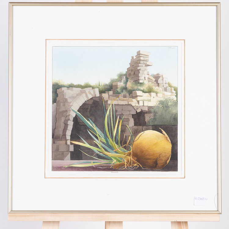 Gedetailleerde aquarel met op de voorgrond een ui waar sprieten uit groeien tegen een achtergrond van een ruïne met begroeiing. De titel van het werk, 'Memento', verwijst vermoedelijk naar de uitspraak 'memento mori', wat 'gedenk te sterven' betekent. De ui waar nieuw leven uit groeit en het vervallen bouwwerk kunnen binnen dat thema gezien worden als symbolen voor leven en dood. Het werk is ingelijst achter glas met passe-partout. Kunstenaar Haije Gemser (Leeuwarden, 1940) maakt aquarellen, schilderijen en etsen. Dieren, met in het bijzonder vogels, zijn een veelvoorkomend onderwerp in zijn werk. In Velsen-Zuid heeft Gemser zijn eigen atelier en galerie. Datering: 2000. Conditie: het werk is in goede conditie. De lijst heeft een stukje gebroken glas rechtsonder. De lijst heeft gebruikssporen. Afmetingen: lijst ca. 50.5 x 50.5 cm, werk ca. 32 x 32 cm.