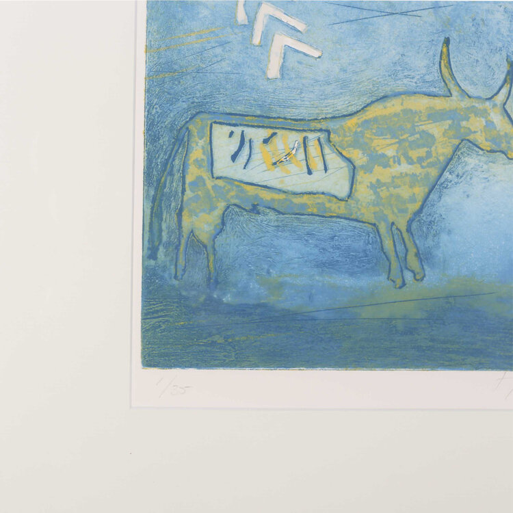 Hans Heijman, zonder titel, 1995. Gekleurde ets oplage 1/35. Kleurrijke voorstelling tegen blauwe achtergrond toont dieren geïnspireerd op grotschilderingen. Conditie: Lijst toont sporen van gebruik. Afmetingen beeldvlak 40 x 39 cm; incl. lijst: 60,5 x 60,5 cm.