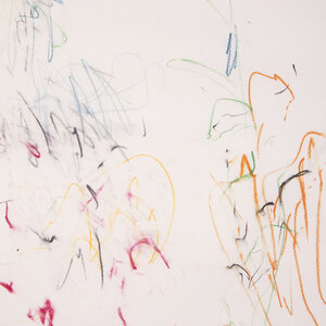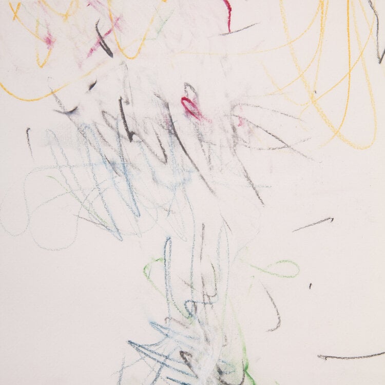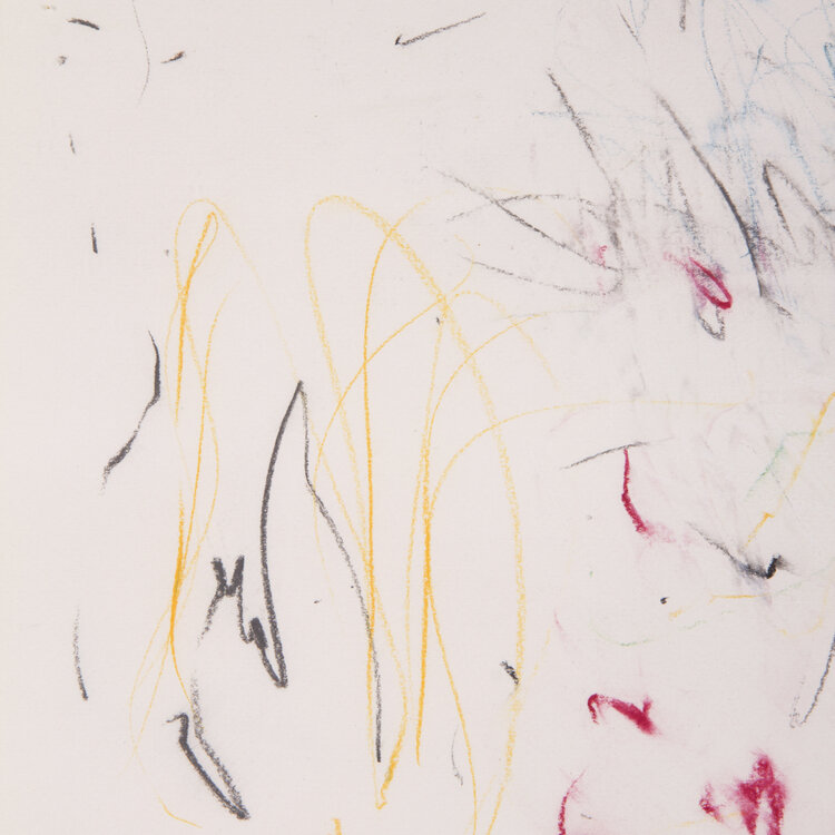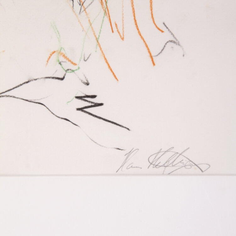 Een kleurrijk abstract werk in krijt op papier. Gesigneerd rechtsonder. Datering: omstreeks 1988. Conditie: goed, de lijst heeft krassen. Afmetingen: 71 x 91 cm.