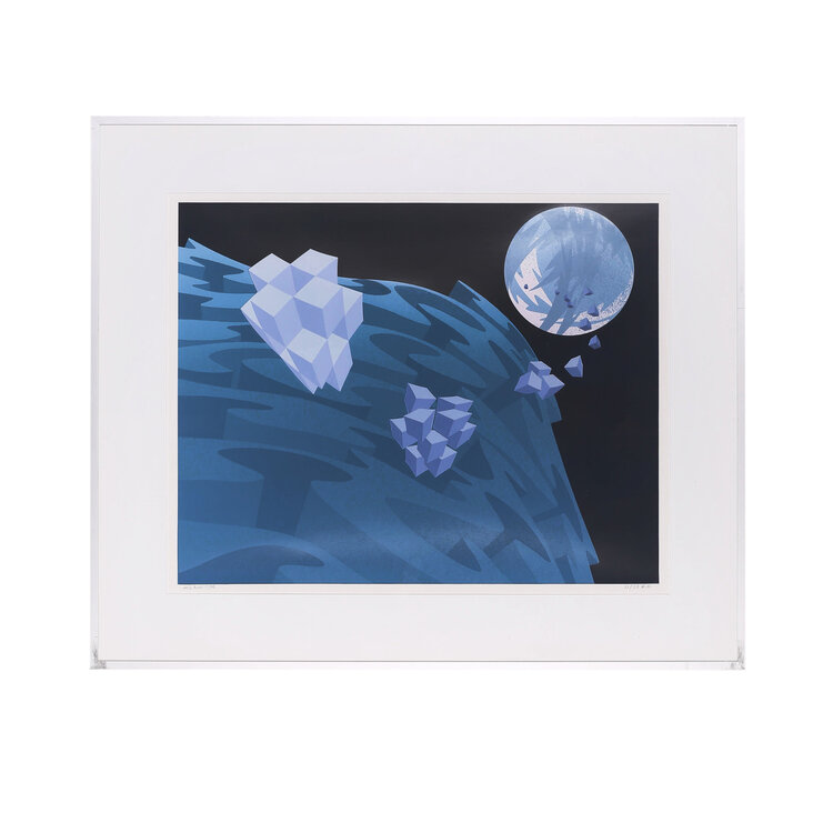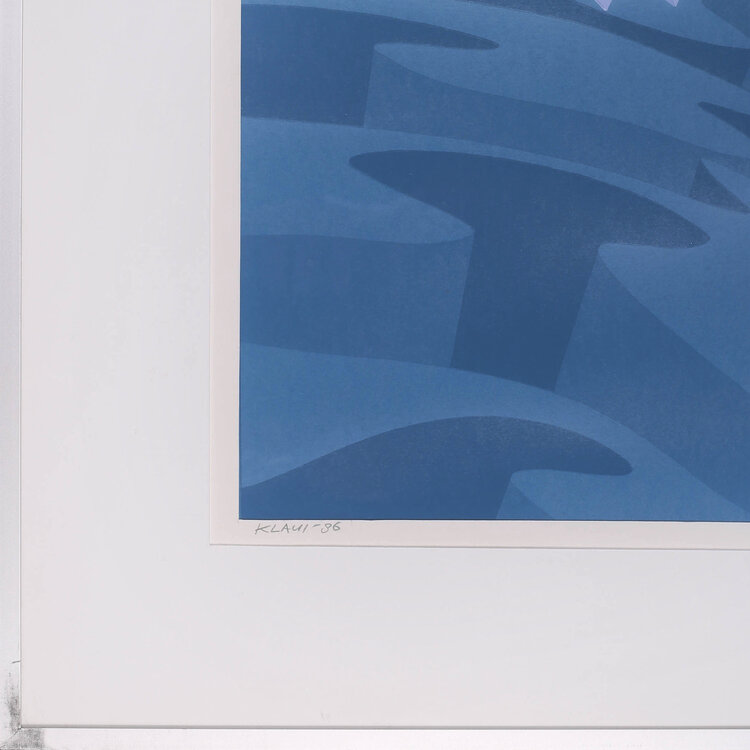 Hans Klaui, Zonder titel, 1986. Zeefdruk op papier in metalen lijst, oplage 21/23. Abstracte voorstelling van blauwe vormen voor een zwarte achtergrond. Signatuur en jaar linksonder, oplagenummer rechtsonder. Conditie: goed, gebruikssporen aan lijst. Afmeting werk zonder lijst: 38 x 48 cm, incl. lijst: 56 x 67 cm.