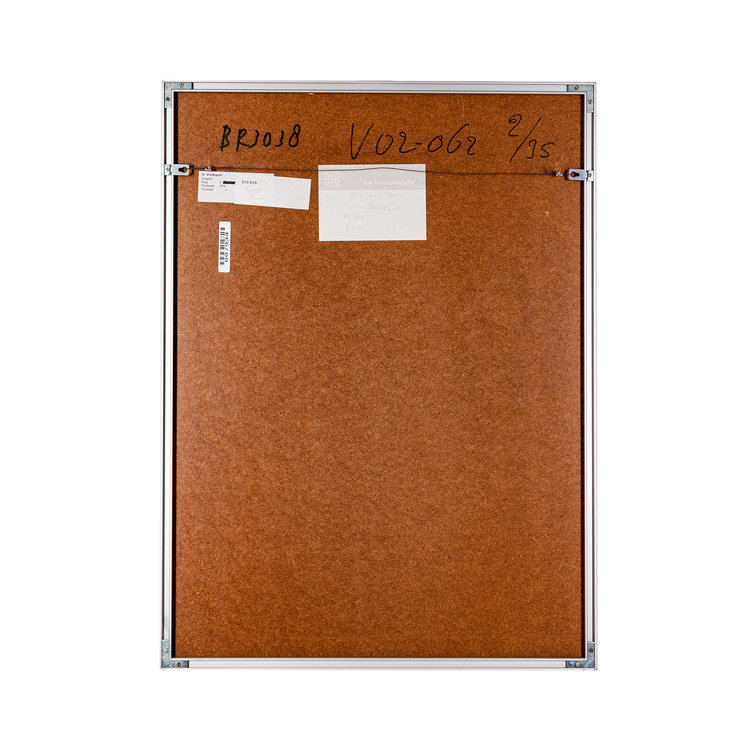 Hans Vredegoor, Enigma, 1987. Ets in metalen lijst, oplage 2/87. Abstracte voorstelling van donkere vormen en lijnen met rode en blauwe accenten. Linksonder titel en oplagenummer, rechtsonder signatuur en jaartal. Conditie: goed, gebruikssporen aan lijst. Afmeting werk zonder lijst: 50 x 39 cm.
