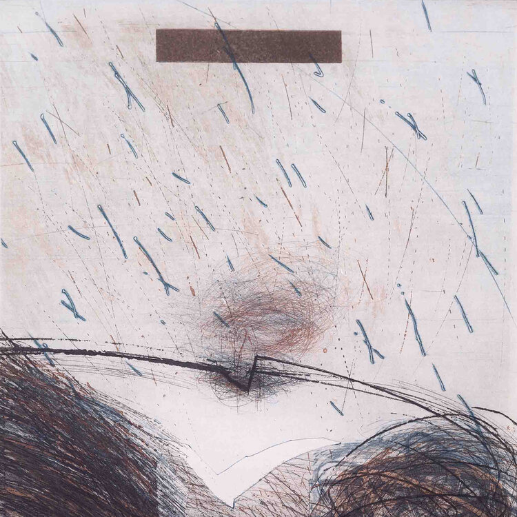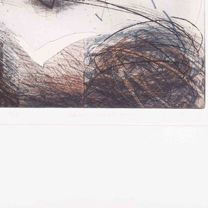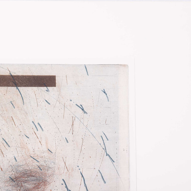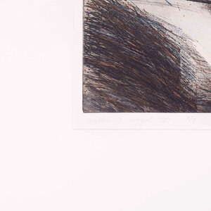 Hans Vredegoor, Vallende vogel IV, 1984. Kleurenets in passe-partout zonder lijst, oplage 6/9. Afbeelding van een vogel in de lucht in zwart en blauw. Rechtsonder signatuur. Conditie: papier en passe-partout zijn verkleurd. Afmeting passe-partout: 60 x 60 cm.