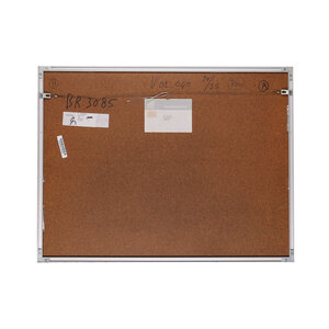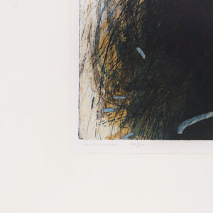 Hans Vredegoor, Intermezzo, 1986. Ets in metalen lijst, oplage 20/95. Abstracte voorstelling van donkere vormen en lijnen voor een lichte achtergrond. Linksonder titel en oplagenummer, rechtsonder signatuur en jaartal. Conditie: goed, gebruikssporen aan lijst. Afmeting werk zonder lijst: 39 x 49 cm; incl. lijst: 60 x 80 cm.
