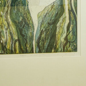 Hans Vredegoor, Liggen in het gras, 1986. Ets in zilverkleurige lijst, oplage 16/35. Abstracte ets in groentinten met titel, oplage, signatuur en jaartal aan de onderzijde. Conditie: De ets is in goede conditie al toont de lijst sporen van gebruik. Afmetingen: beeldvlak 43 x 43 cm.