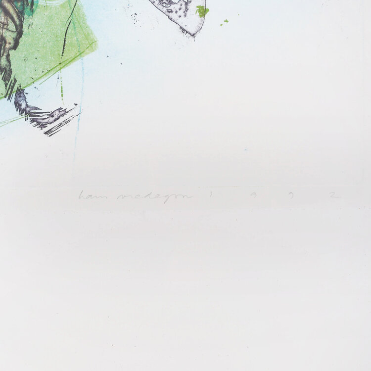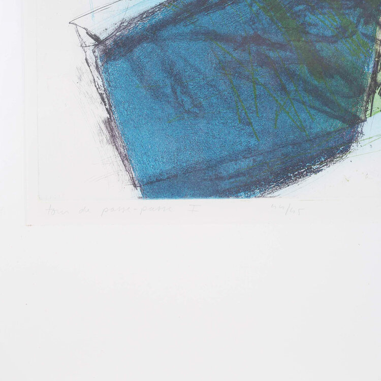 Hans Vredegoor, Tour de passe-passe 1, 1992. Ets in metalen lijst, oplage 44/45. Abstracte voorstelling van zwarte lijnen en kleurrijke accenten voor een blauwe achtergrond. Titel en oplagenummer linksonder, signatuur en jaartal rechtsonder. Conditie: goed, gebruikssporen aan lijst. Afmeting werk zonder lijst: 76 x 46 cm.