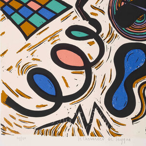 Hans Wap, Le chevalier de Leygua, 1989. Zeefdruk op papier zonder lijst, oplage 24/35. Afbeelding van een man op een springend paard met daaromheen zwarte lijnen en kleurvlakken met blauw, bruin en groen. Signatuur rechtsonder. Conditie: prima. Afmeting papier: 76 x 56 cm.