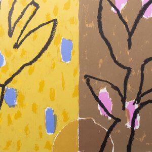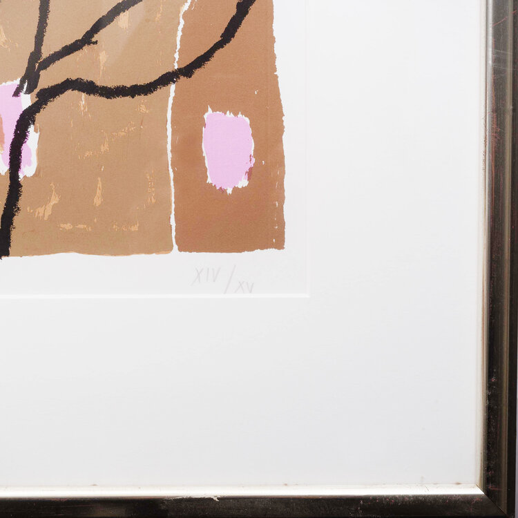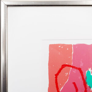 Harry Gerritz, 'Compositie', 1998. Zeefdruk op papier in zilverkleurige lijst met passe-partout, oplage XIV/XV. Het werk is verdeeld in vier vlakken met figuren en vormen, ieder met een eigen kleur. In het midden een wit huisje. Een veelkleurig werk in rood, groen, geel en bruin. Linksonder signatuur en jaar, rechtsonder oplagenummer. Conditie: goed, de lijst toont lichte gebruikssporen. Afmeting lijst: 93 x 72 cm.