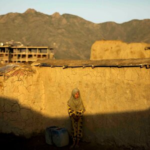 Hedayat Amid, 'Girl waiting for water', 29-4-2020. C-print achter acrylaat. "Een ontheemd meisje wacht naast haar watercontainers om deze te laten vullen vanuit een tankwagen buiten haar tijdelijke onderkomen in Kabul." Deze foto is geëxposeerd bij de fototentoonstelling ‘Hope & Fear’ in Museum Vlaardingen in 2023. De foto's zijn van de Vlaardingse NRC-fotograaf / Afghaanse oorlogsfotograaf Hedayat Amid. Ze tonen het dagelijkse leven in Afghanistan voor de machtsovername door de Taliban in 2021. Het zijn indrukwekkende foto's van zijn laatste jaar in Afghanistan, voor hij moest vluchten voor de Taliban en in Vlaardingen terecht kwam. Hedayat Amid is genomineerd voor de categorie Documentair Nationaal van de Zilveren Camera 2024. De foto's zijn hoogwaardig afgedrukt op Polielettronica fotoafdruk, op Fujifilm DPII glossy fotopapier, verlijmd achter 3mm helder acrylaat, op 3mm Dibond, met aluminium. Conditie: goed. Afmetingen: 80 x 120 cm.
