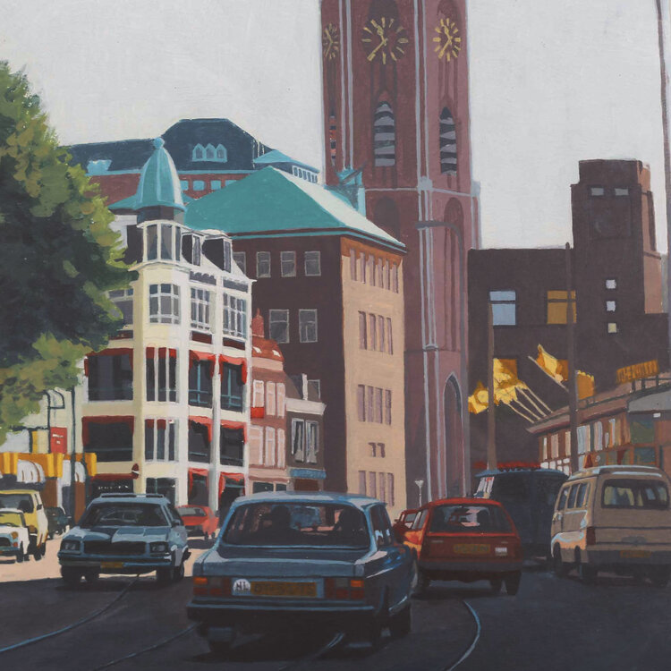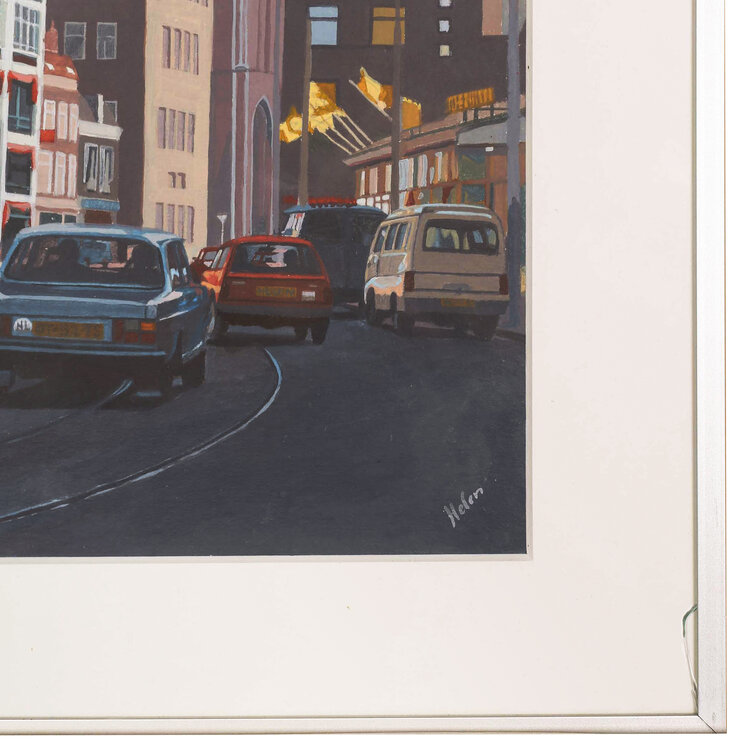 Helen van der Veen, 'De Haagse Toren', jaartal onbekend. Acryl op papier in metalen lijst. Realistische schildering van een stadsgezicht met in het midden de toren van de Grote of Sint-Jacobskerk, gezien vanaf de Torenstraat. Rechtsonder signatuur. Conditie: goed, gebruikssporen aan lijst. Afmeting werk zonder lijst: 39 x 29 cm.