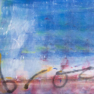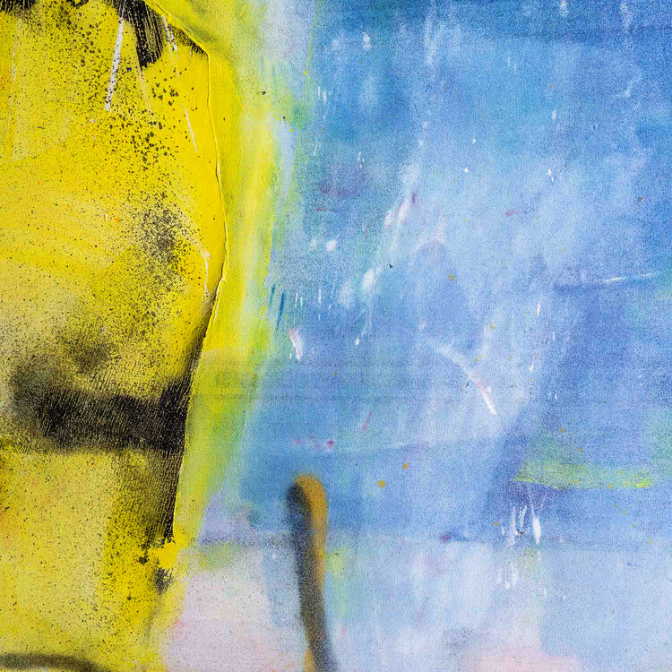 Herman Brood, '2 figuren', jaartal onbekend. Acryl op luifeldoek gespannen op hout zonder lijst. Twee figuren in geel voor een blauwe achtergrond. Onderin in zwart gesigneerd met 'brood'. Door de verf heen schijnen de strepen van het zonnescherm door, wat het werk een grafisch effect geeft. Een certificaat van echtheid is bijgeleverd. Conditie: goed. Afmeting doek: 69 x 185 cm.