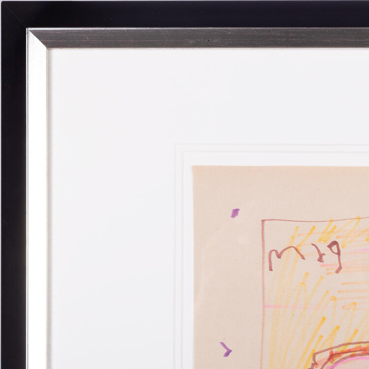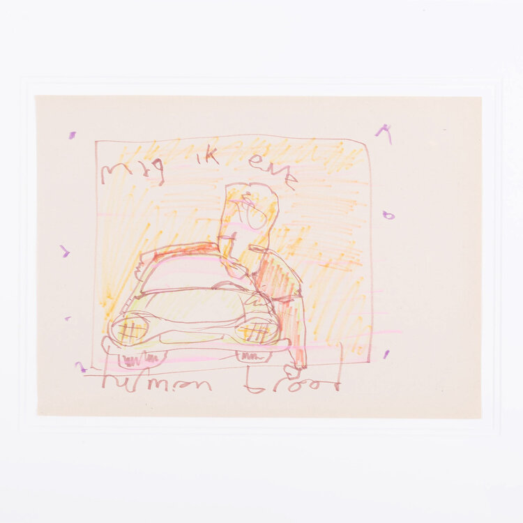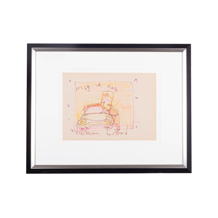 Herman Brood, 'Mag ik even', jaartal onbekend. Tekening met marker op papier in zwart met zilver kleurige lijst. Afbeelding van een man met een groene auto in een geel kader. Onderin gesigneerd met 'herman brood'. Een certificaat van echtheid wordt meegeleverd. Conditie: goed. Afmetingen tekening: 29 x 42 cm, lijst: 65,5 x 72,5 cm.