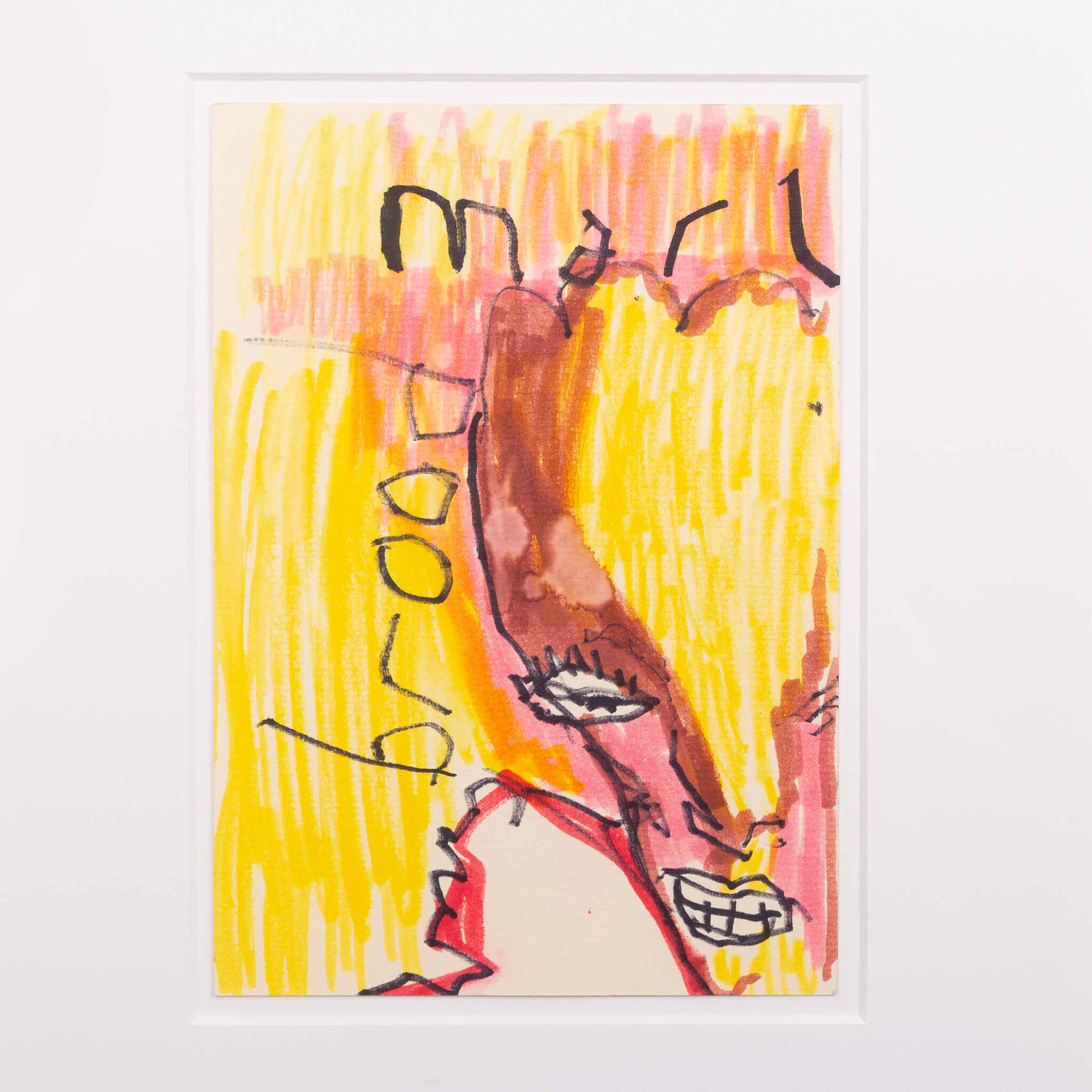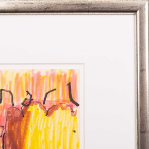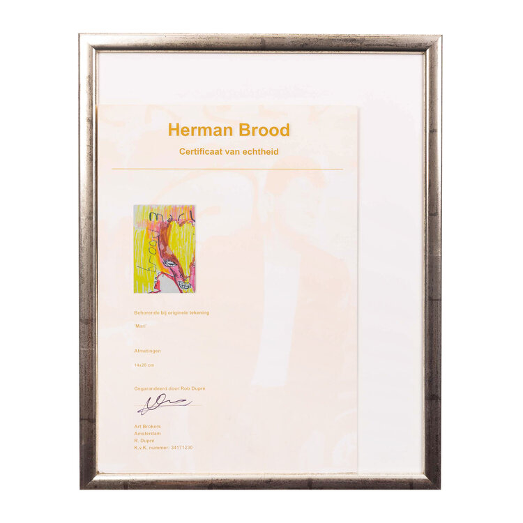 Herman Brood, Mari, jaartal onbekend. Tekening met marker op papier in zilverkleurige lijst. Portret van een vrouw en in geel, bruin en roze voor een roze met gele achtergrond. Bovenaan is geschreven 'mari'; links gesigneerd met 'brood'. Een certificaat van echtheid is bijgeleverd. Conditie: goed. Afmeting werk zonder lijst: 20 x 14 cm, afmeting lijst: 36 x 31 cm.