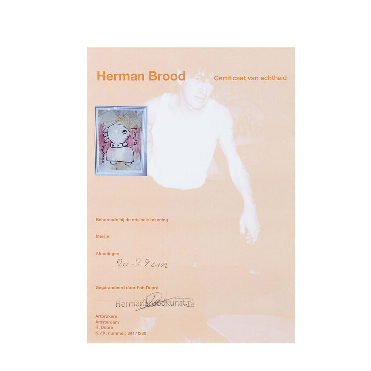 Herman Brood, 'Meisje', jaartal onbekend. Tekening met marker op papier in zwart met zilver kleurige lijst. Geabstraheerd portret van een meisje voor een rood-gele achtergrond. Links gesigneerd met 'herman' en rechts 'brood'. Een certificaat van echtheid wordt meegeleverd. Conditie: goed. Afmetingen tekening: 29 x 20 cm, lijst: 57 x 47 cm.