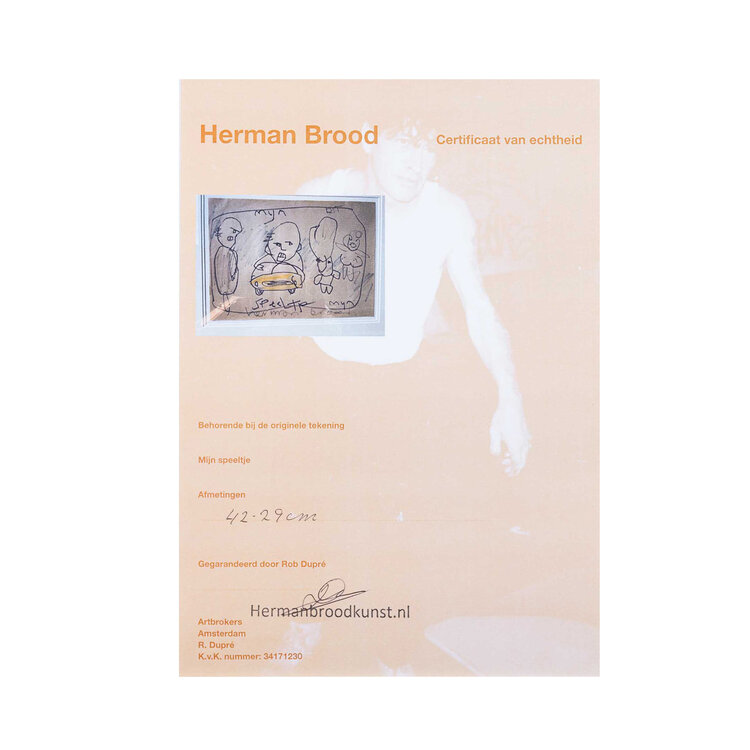 Herman Brood, 'Mijn speeltje', jaartal onbekend. Tekening met marker op papier in zwart met zilver kleurige lijst. Afbeelding van twee mannen, een in een gele auto; daarnaast twee knuffeldieren. Onderin gesigneerd met 'herman brood'. Een certificaat van echtheid wordt meegeleverd. Conditie: goed. Afmetingen tekening: 29 x 42 cm, lijst: 65,5 x 72,5 cm.
