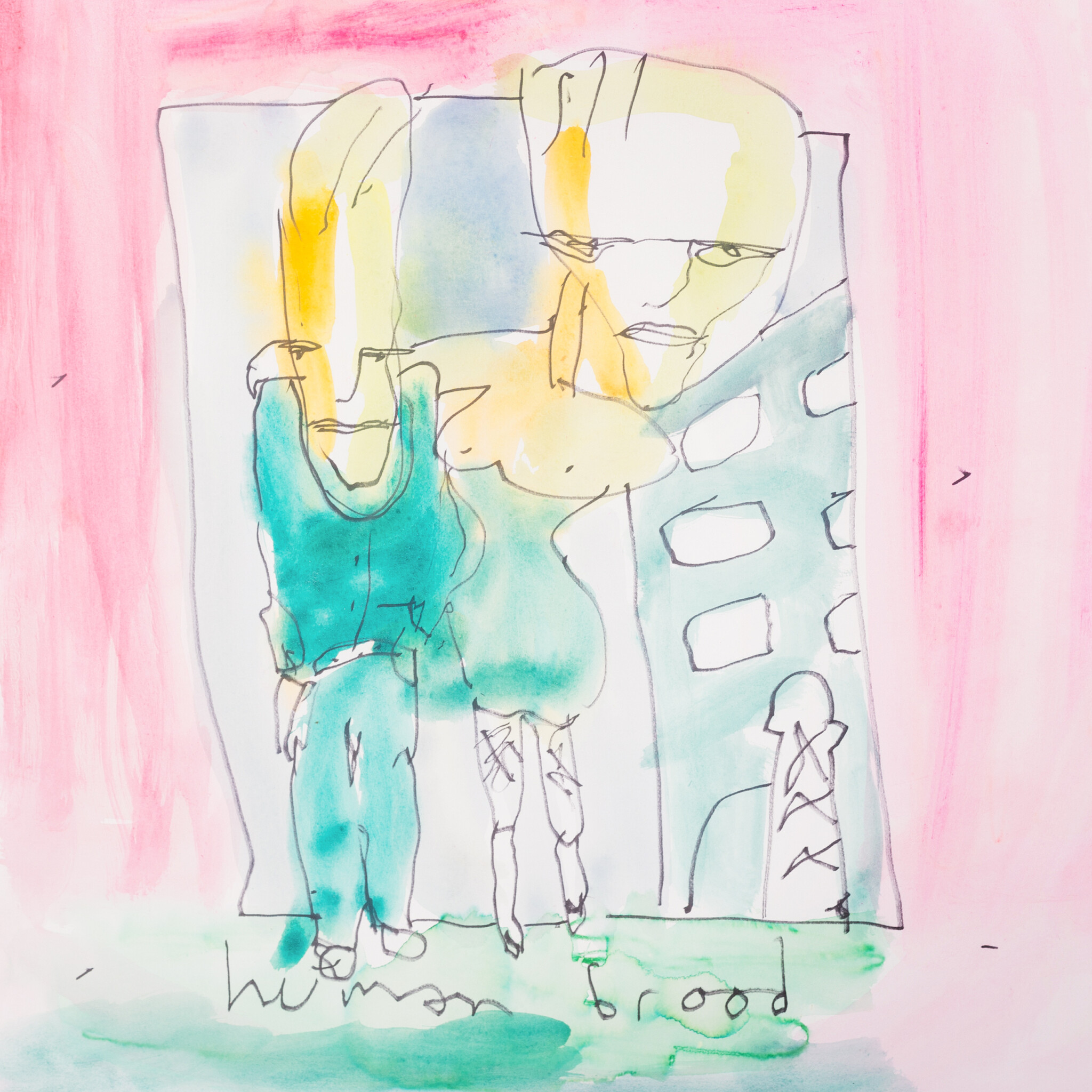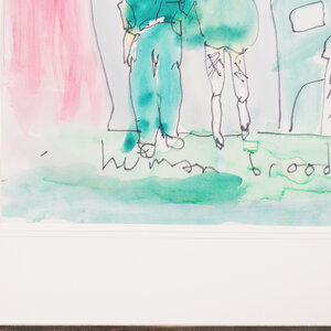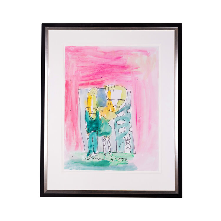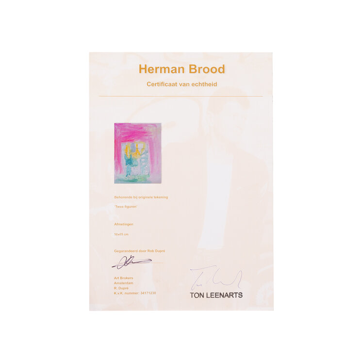 Herman Brood, 'Twee figuren', jaartal onbekend. Tekening met marker op papier in zwart met zilverkleurige lijst. Portret van een man en vrouw voor kader met gebouwen en een roze achtergrond. Onderin gesigneerd met 'herman brood'. Het werk is ingelijst met dubbel passe-partout achter museumglas. Een certificaat van echtheid is bijgeleverd. Conditie: goed. Afmetingen tekening: 65 x 50 cm, lijst: 91 x 75 cm.