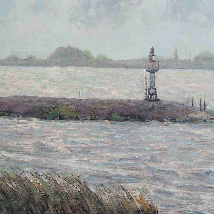 Hugo Liebe, Wolderwijs, jaartal onbekend. Krijttekening op papier (gewassen tekening) in lichtgrijs passe-partout zonder lijst. Afbeelding van een pier met lichtbaken in een haven in de grijs- en blauwtinten. Rechtsonder signatuur. Conditie: prima, het passe-partout toont lichte verkleuring. Afmeting passe-partout: 65 x 88,5 cm.