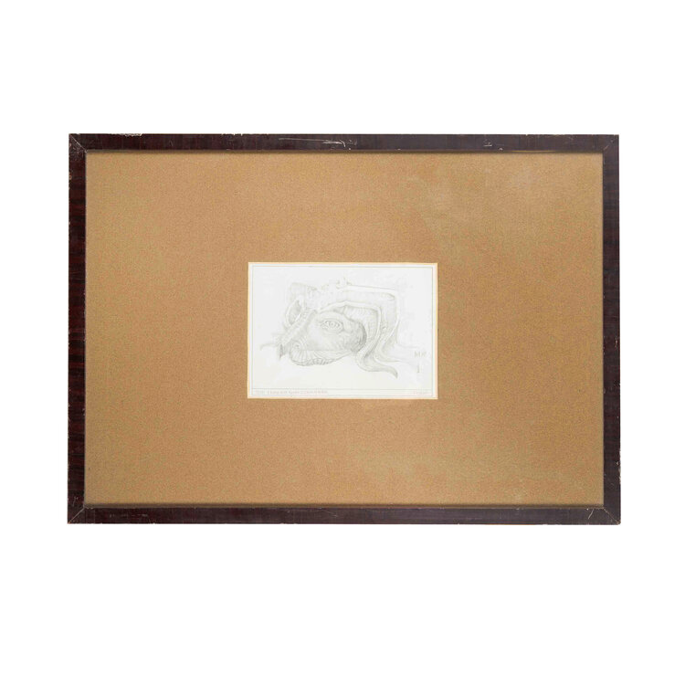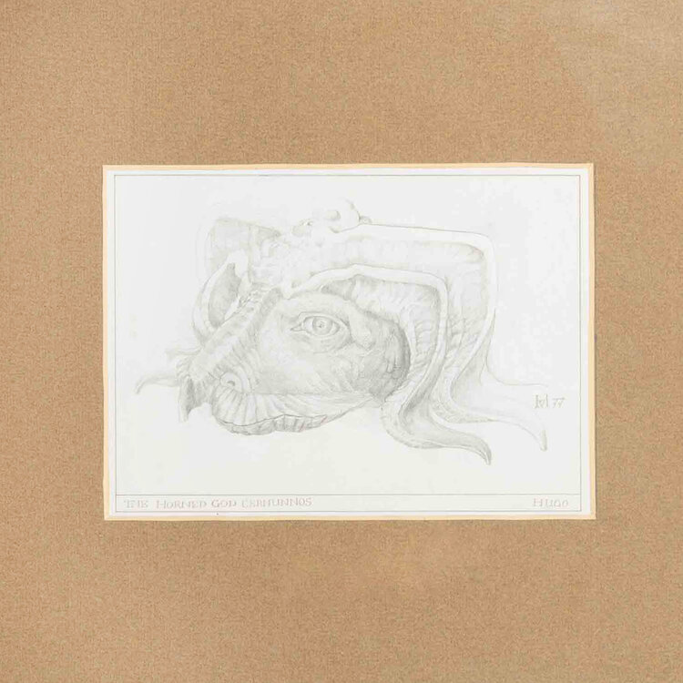 Hugo Vermeulen, The horned God Cernunnos, 1977. Zilverstift op papier in houten lijst. Illustratie van een fantasiedier met hoorns. Rechtsonder signatuur. Conditie: werk in goede staat, lijst toont gebruikssporen zoals krassen. Afmetingen: werk: 13 x 18 cm, lijst 37 x 52 cm.