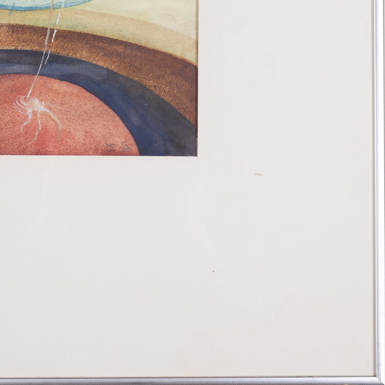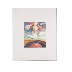 Ineke Ebbinge, 'Dwingerige mens'. Aquarel op papier in metalen lijst met passe-partout. Afbeelding van een plassend jongetje dat zweeft. Signatuur rechtsonder. Datering: 1980. Conditie: gebruikssporen lijst, taperesten op glas. Afmetingen lijst: 60,5 x 70,5 cm; beeldvlak: 28,5 x 25 cm.