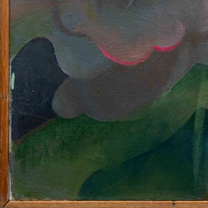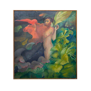Ineke Ebbinge, 'Halt', 1981. Olieverf op doek in houten lijst. Portret van een naakte vrouw in een natuurlijke omgeving. Uit haar hand steekt een roze kunststof draadje wat door het doek heen gestoken is en aan de achterzijde met een knoopje bevestigd. Signatuur rechtsonder. Conditie: op meerdere plekken is de verflaag beschadigd en komt een groene onderlaag tevoorschijn. Afmetingen incl lijst: 100 x 91 cm.