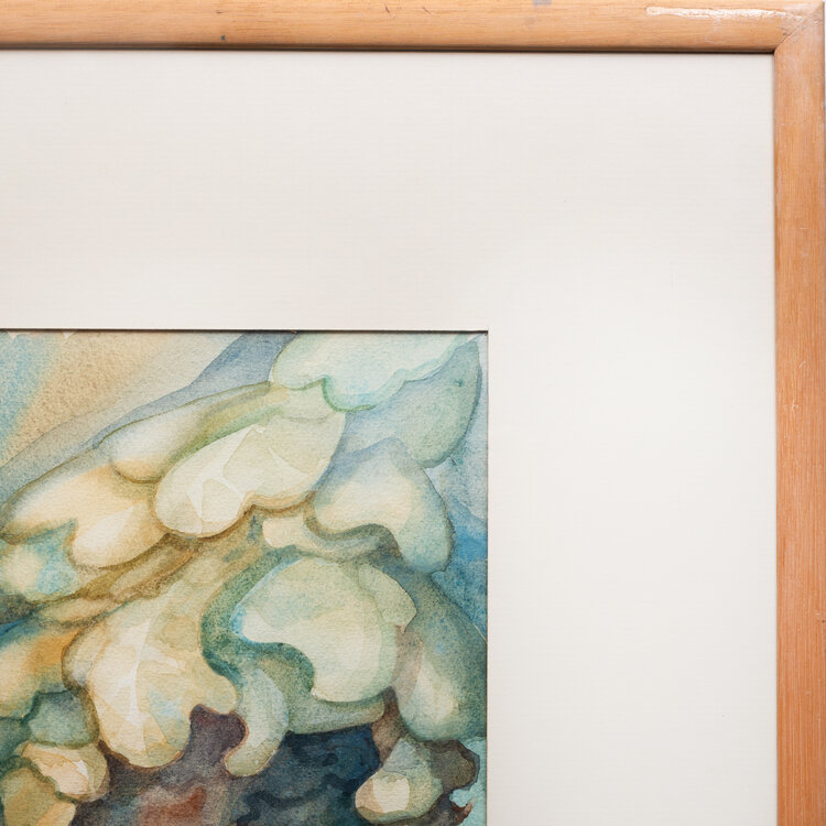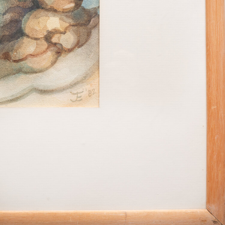 Ineke Ebbinge, 'Verscholen'. Aquarel op papier in houten lijst. Abstracte afbeelding van ronde vormen in bruin-, groen- en blauwtinten. Signatuur rechtsonder. Datering: 1982. Conditie: lijst is beschadigd, werk is in goede staat. Afmetingen lijst: 63,5 x 53,5 cm; beeldvlak: 36 x 25 cm.