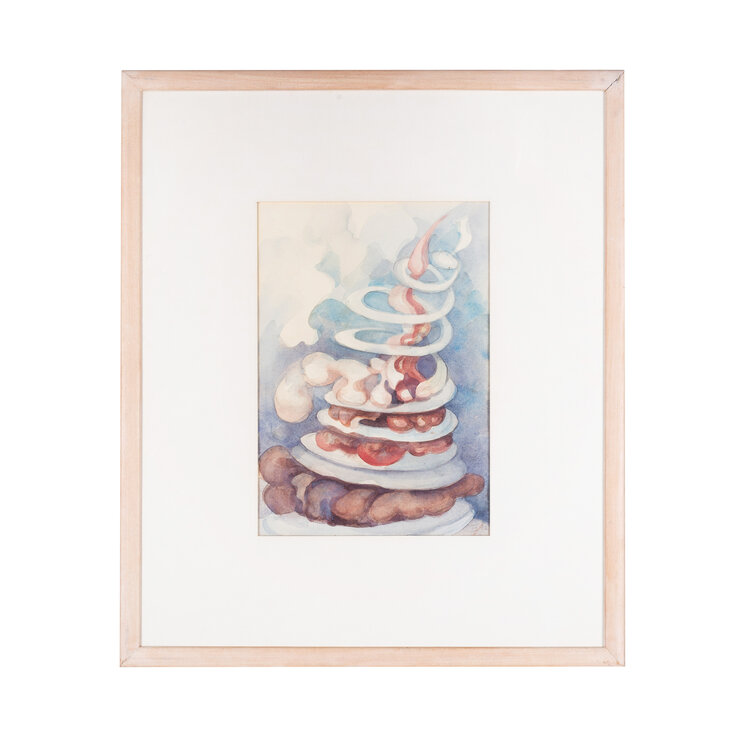 Ineke Ebbinge, 'Stemming III'. Aquarel op papier in houten lijst. Abstracte afbeelding van een spiraal in rode-, roze- en blauwtinten. Signatuur rechtsonder. Datering: 1982.
