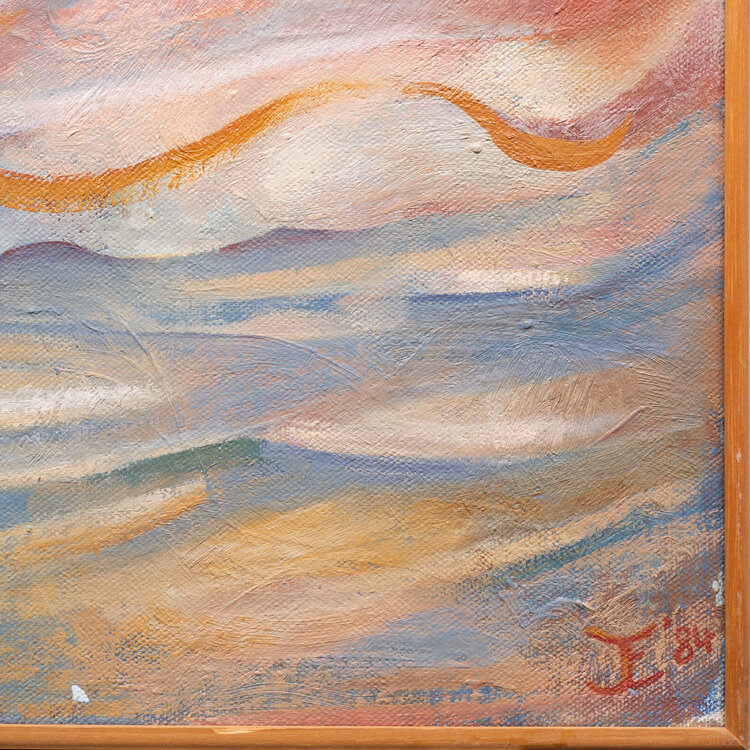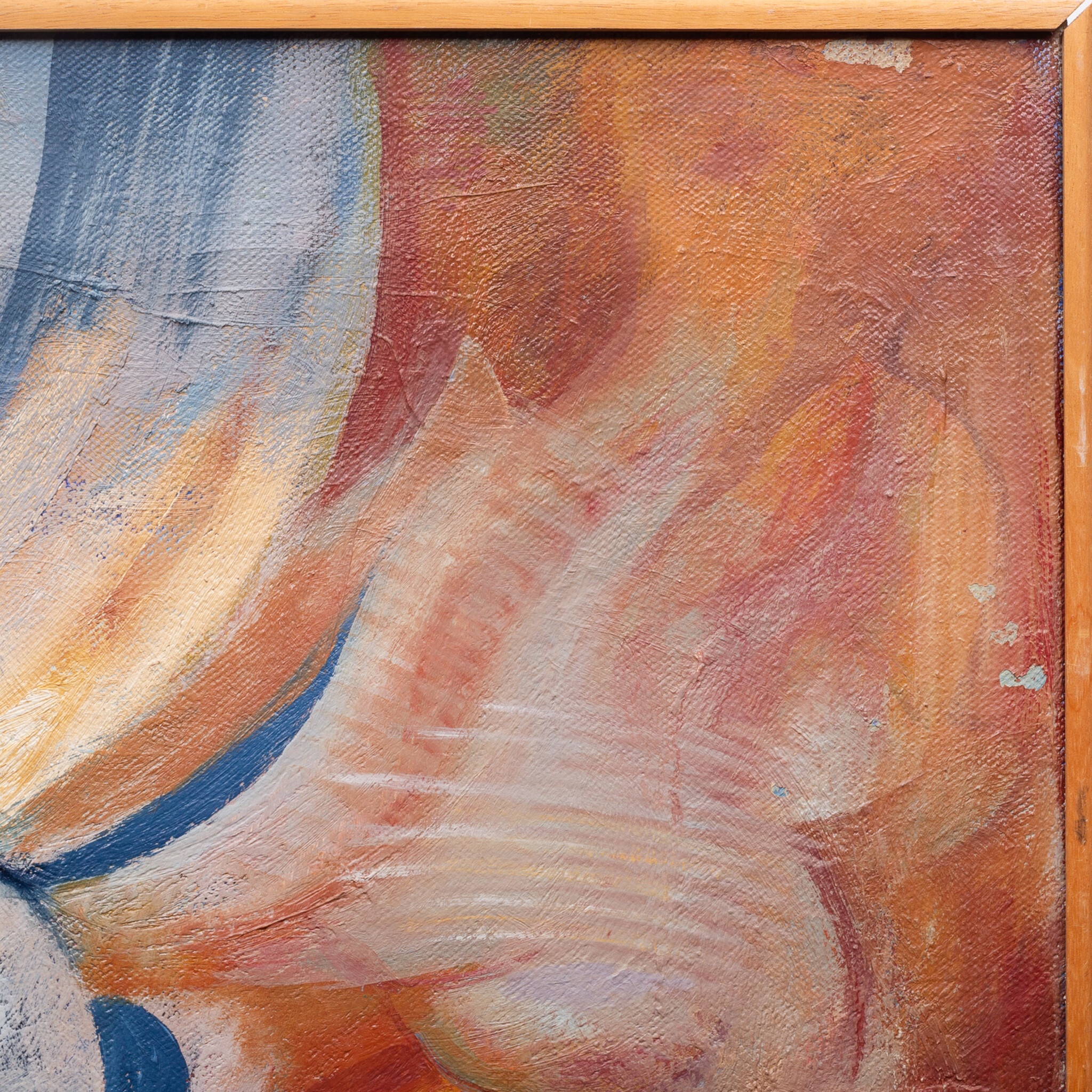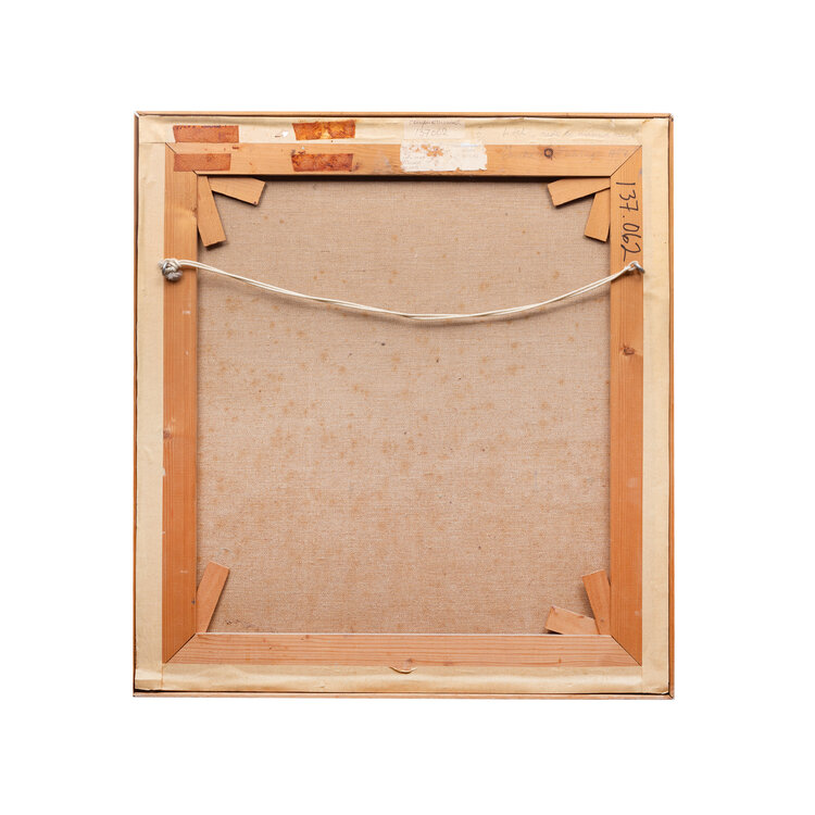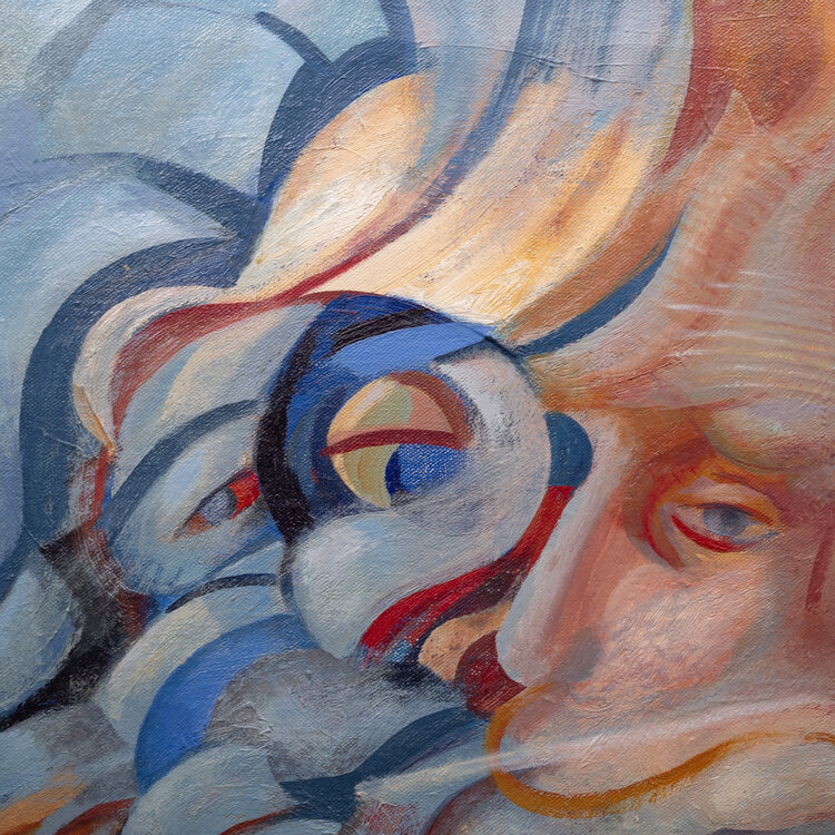 Ineke Ebbinge, 'Oude en nieuwe mens', 1984. Olieverf op doek in houten lijst. Abstracte compositie in blauw en rood; in het midden links en rechts een oog. Signatuur rechtsonder. Conditie: op een aantal plekken verfverlies en lijst toont gebruikssporen. Afmetingen lijst: 66 x 61 cm.