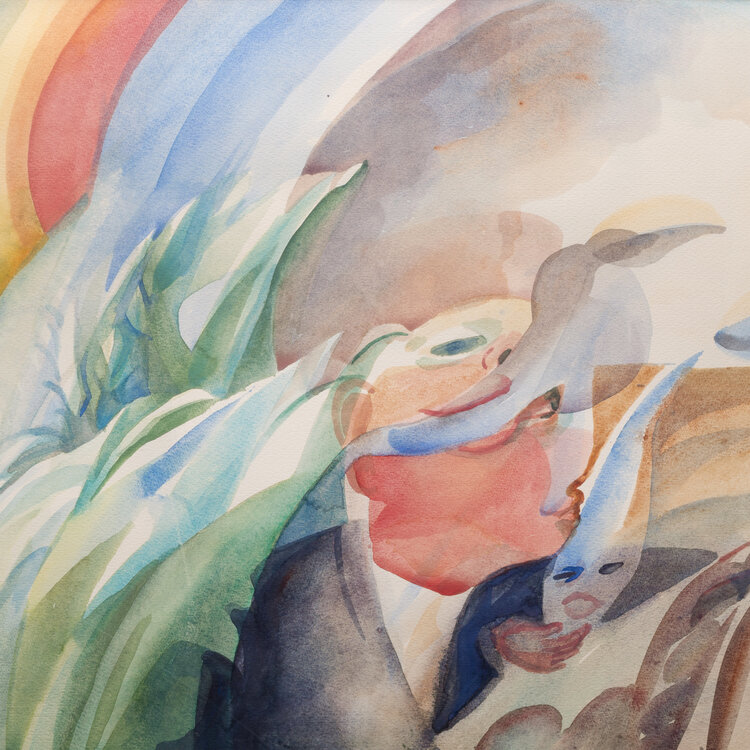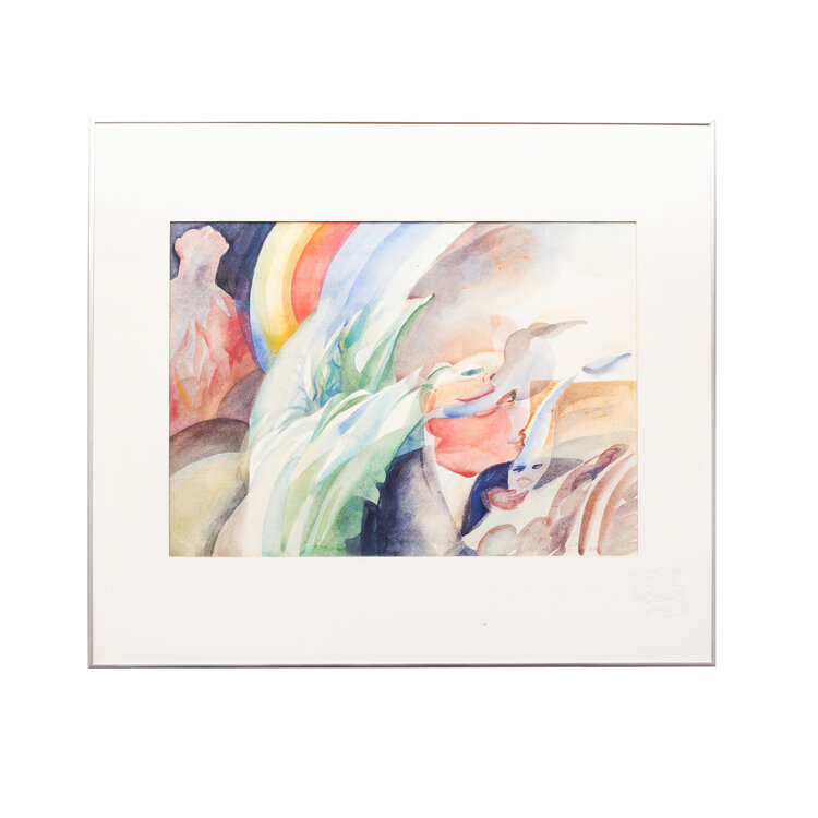 Ineke Ebbinge, 'Politicus', 1980. Aquarel op papier in metalen lijst. Surrealistische compositie met diverse figuren, in het midden een soort regenboog. Signatuur rechtsonder. Conditie: passe-partout is verkleurd en op de kunststof plaat zit een vlek en krassen. Afmetingen lijst: 70 x 80 cm; beeldvlak: 42 x 59 cm.