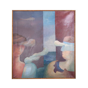 Ineke Ebbinge, 'Verhouding 1', 1961. Olieverf op doek in houten omlijsting. Fantasievolle compositie met een man en een vrouw in rood, blauw en paars. Signatuur midden onder. Conditie werk: aan de randen een beetje beschadigd, verder in prima staat. Afmetingen: ca. 66 x 62 cm.