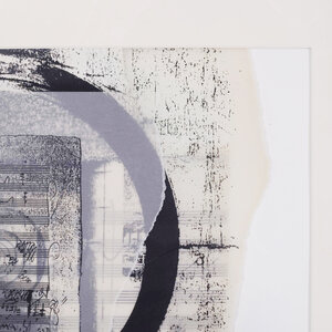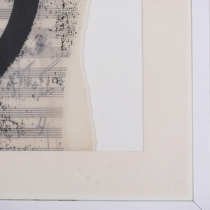 Inez Fritschy, Beethoven: first movement opus 69 I, jaartal onbekend. Gemengde techniek op papier in witte lijst. Collectie bladmuziek op kalkpapier in lijst met op de achtergrond een vel met zwarte cirkel. Signatuur rechtsonder. Conditie: goed, gebruikssporen aan lijst. Afmetingen lijst. 40 x 40 cm.
