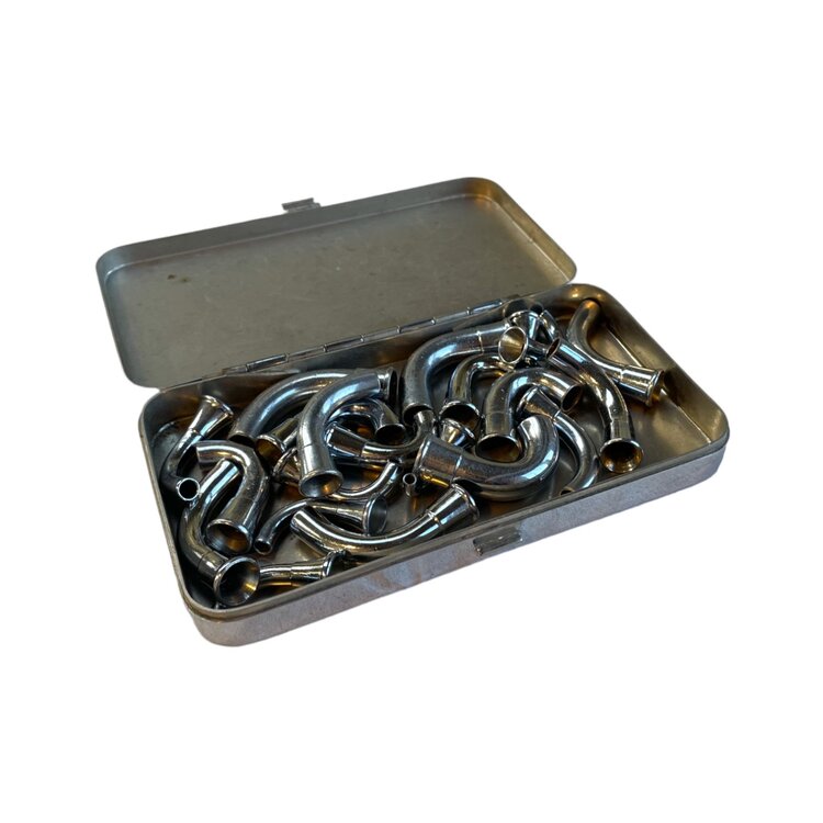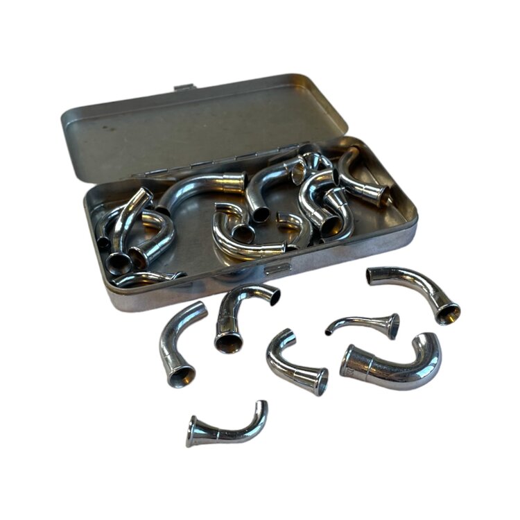 Metalen boogjes voor rubberen infuus slangen om doorknikken te voorkomen. De boogjes zitten opgeborgen in een metalen doosje. Naast de sluiting gemerkt met 'BRITISH MAKE'. Datering: onbekend. Conditie: goed, met gebruikssporen. Afmetingen doosje: ca. 2 x 15 x 9 cm.