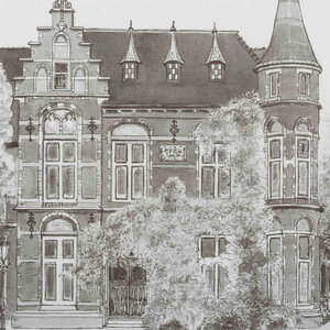 Ingrid van der Loo, Het Raadhuis te Noordwijk, 1984. Reproductie op papier in zwart houten lijst, derde druk, oplage 3/25. Afbeelding van het Raadhuis te Noordwijk; rechtsonder signatuur en jaar. Conditie: goed, lichte gebruikssporen aan lijst. Afmetingen: werk 29 x 39 cm, lijst 41,5 x 51,5 cm.